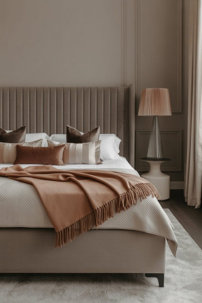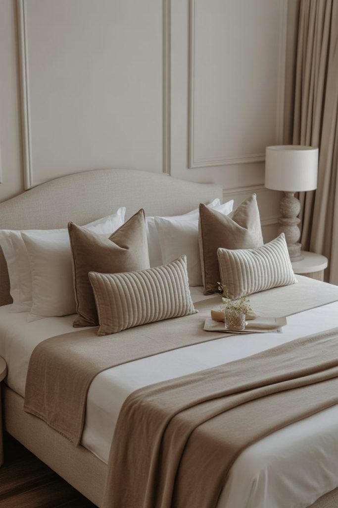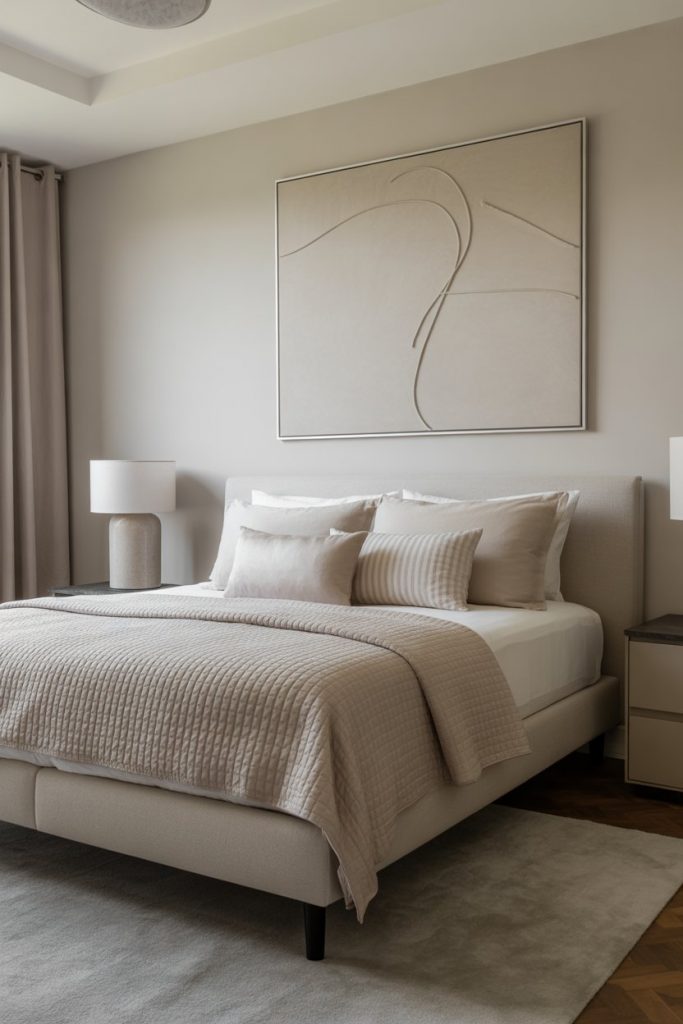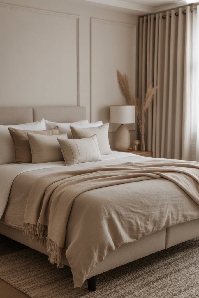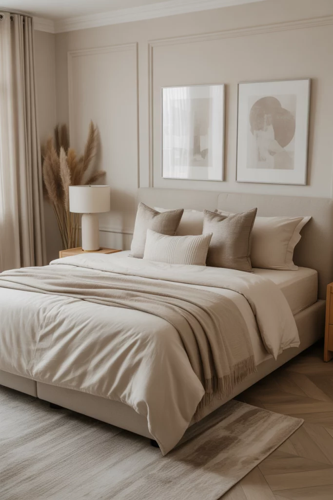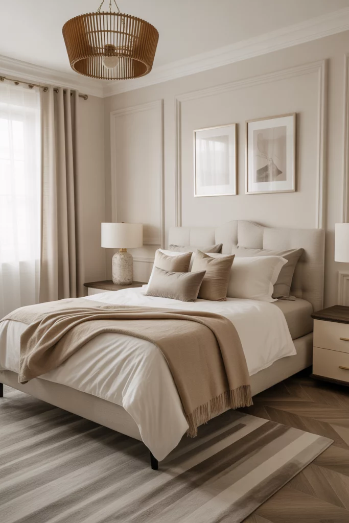 A calm color palette continues to define modern elegance, especially for ideas for couples who want a timeless space. Soft taupe, warm beige, and creamy white make a peaceful color combination that still feels upscale. Add layered linens, minimal wall decor, and subtle metallic accents for a refined yet cozy atmosphere. Emily Henderson often reminds readers that neutral doesn’t mean boring—texture does the heavy lifting and keeps the space elevated.
