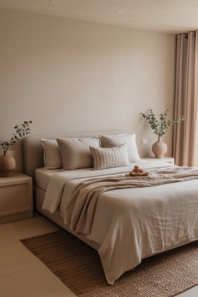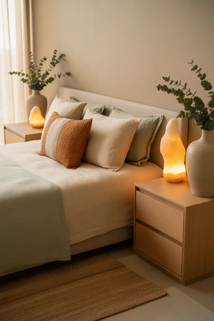 Bringing in soft neutrals, stone textures, and eucalyptus tones turns the bedroom into an at-home spa. This style uses decor inspired by wellness resorts: linen bedding, clay lamps, and pale wood furniture. It works for a simple space or a full luxury suite, especially when paired with aromatherapy diffusers and dimmable lighting. Designers at Parachute Home note that people now crave bedrooms that feel like a slow exhale, not a showroom.
