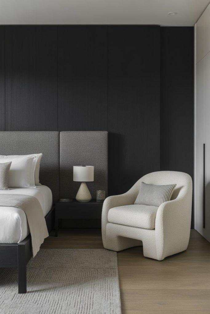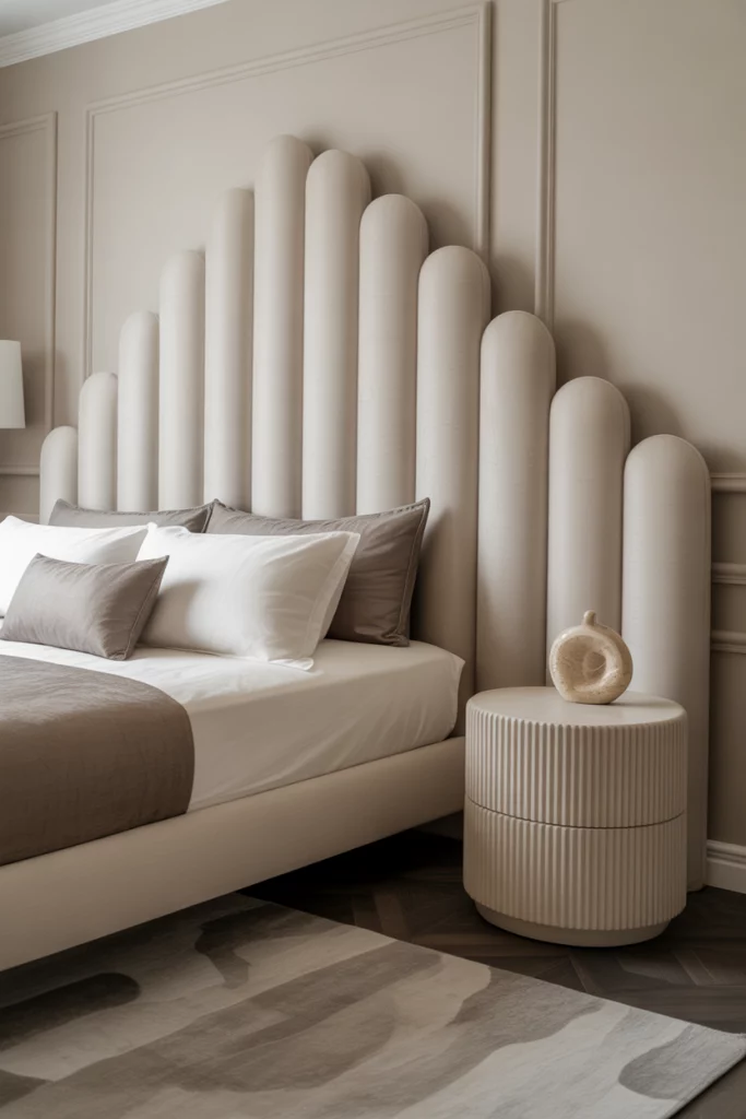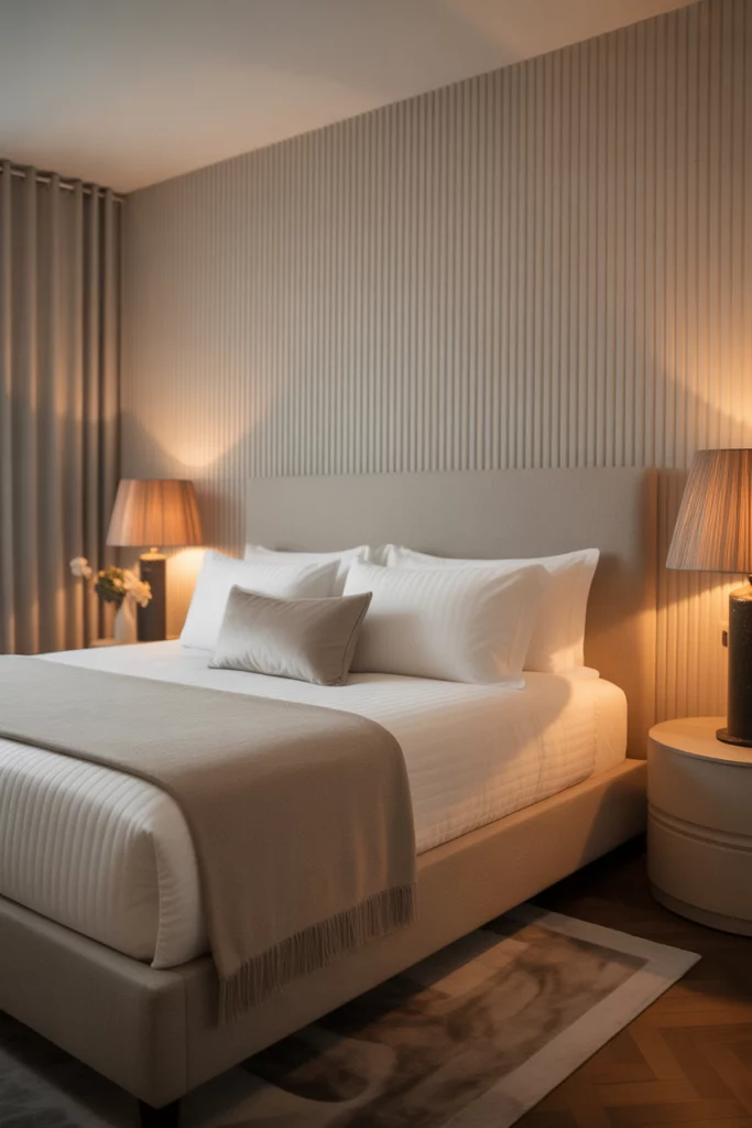 Instead of bold wallpaper, a fabric-wrapped or fluted wood headboard wall adds depth while staying cozy and tactile. It frames the bed like a hotel suite and works with many color schemes, from cream to espresso. House & Garden calls it the “quiet luxury” alternative to murals.