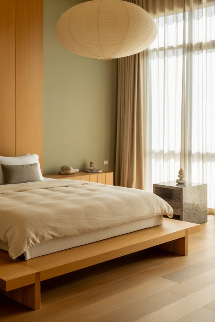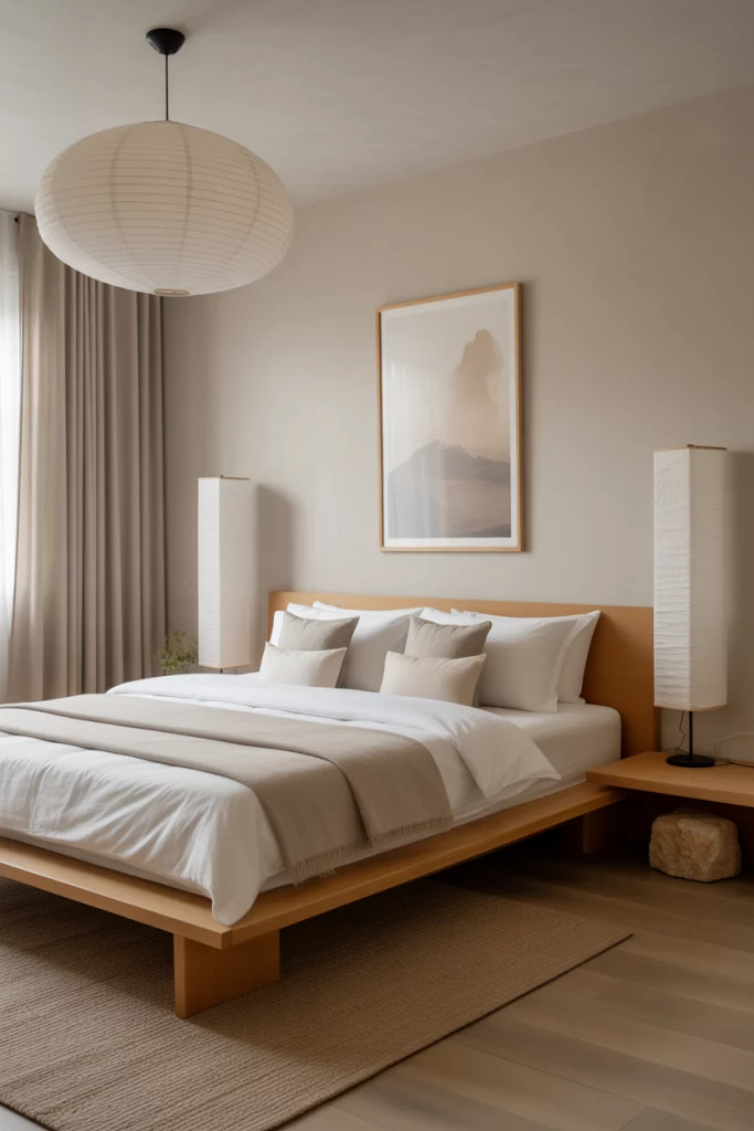 The mix of Japanese restraint and Scandinavian warmth is still booming. Light woods, low beds, paper lamps, and stone accents make a grounding interior for deep rest. It’s especially good for small room layouts where simplicity matters more than decoration. The Calm app’s editorial team often references Japandi as the most “mentally restful” bedroom trend.