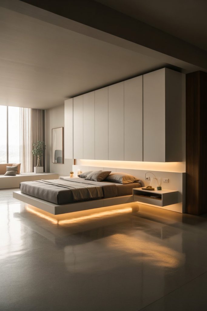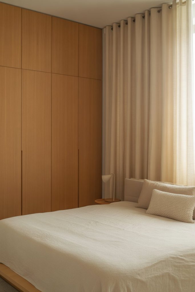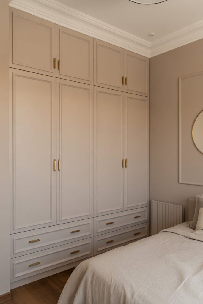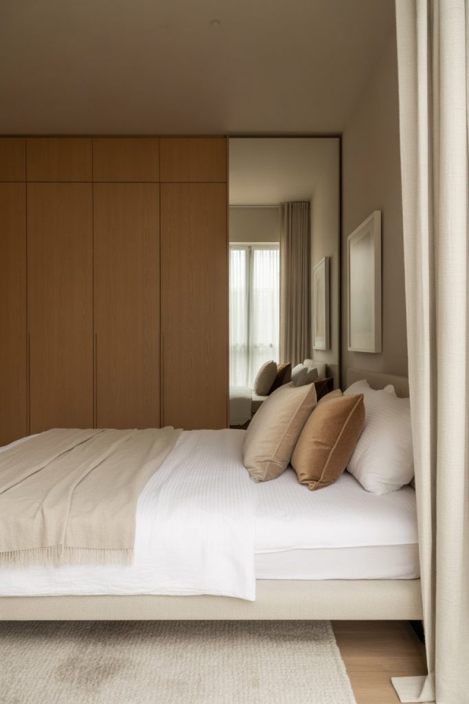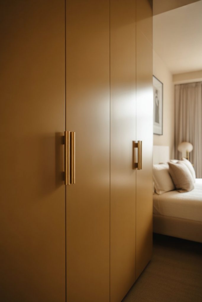 For a small room, a wall-to-wall wardrobe painted the same shade as the walls makes the space appear bigger. Add slim brass pulls or hidden handles for a classy touch. This smart-fit storage trend is spreading on Apartment Therapy because it blends decor ideas with function, creating a seamless hotel-suite vibe without taking square footage.