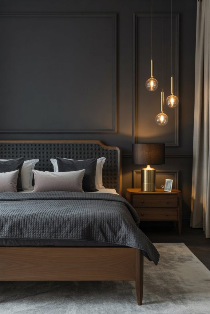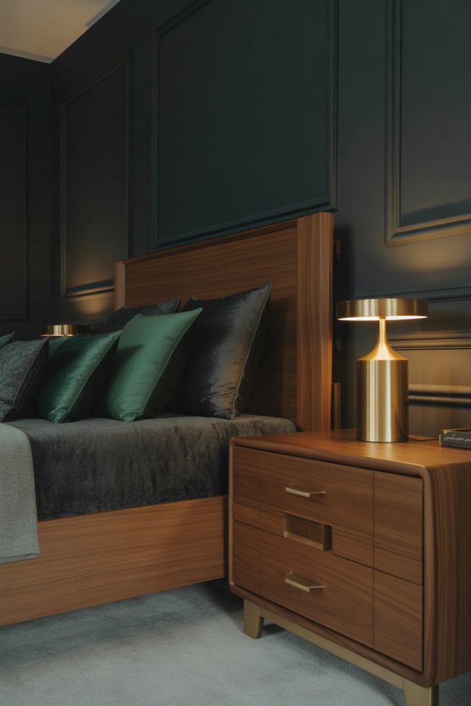 If you love moodier colors, embrace a dark bedroom with charcoal walls, walnut furniture, and warm lighting. Designers at Studio McGee note that dramatic rooms feel surprisingly restful when softened with velvet throws and brass accents. This approach works even in a small room when the layout stays simple and the tones stay consistent. It’s a classy approach for those who want a richer look without clutter.