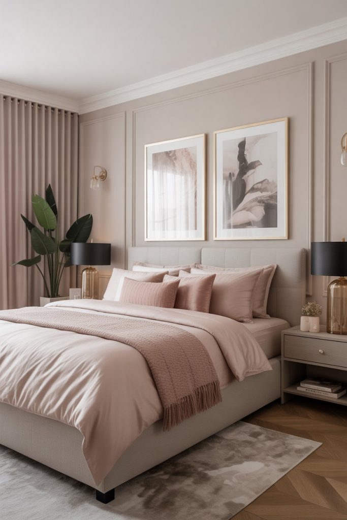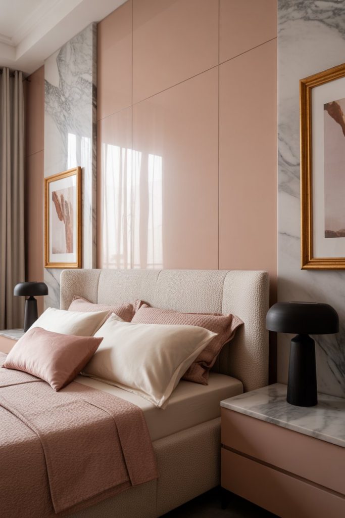 A refined blush pink is back, not the sugary tone of teen rooms but a muted shade designers call “rose dust.” It blends beautifully with marble nightstands, gold frames, and matte black lamps for a classy aesthetic. This palette is especially good for ideas for modern luxury for couples when one partner wants warmth without losing sophistication. Layer with boucle pillows and soft textured drapes for depth.