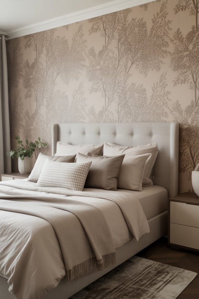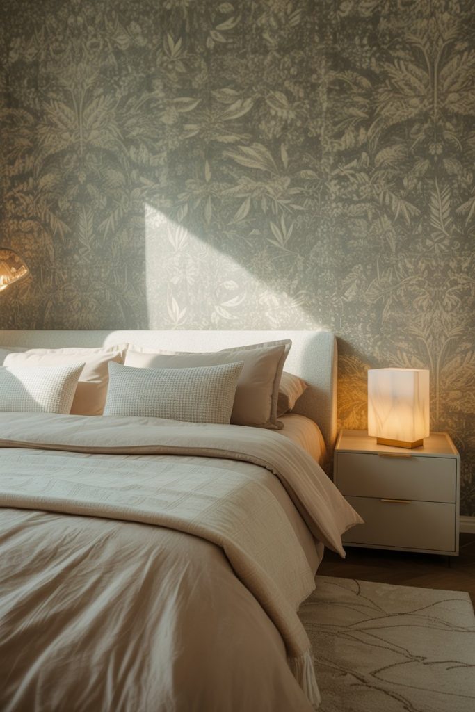 Textured or mural wallpaper is a classy shortcut to depth. Choose botanical neutrals, linen-look patterns, or subtle geometrics for sophisticated interior character. Designers like Justina Blakeney recommend pairing bold walls with quiet bedding so the room still feels balanced. This works in rentals too, thanks to peel-and-stick innovation.