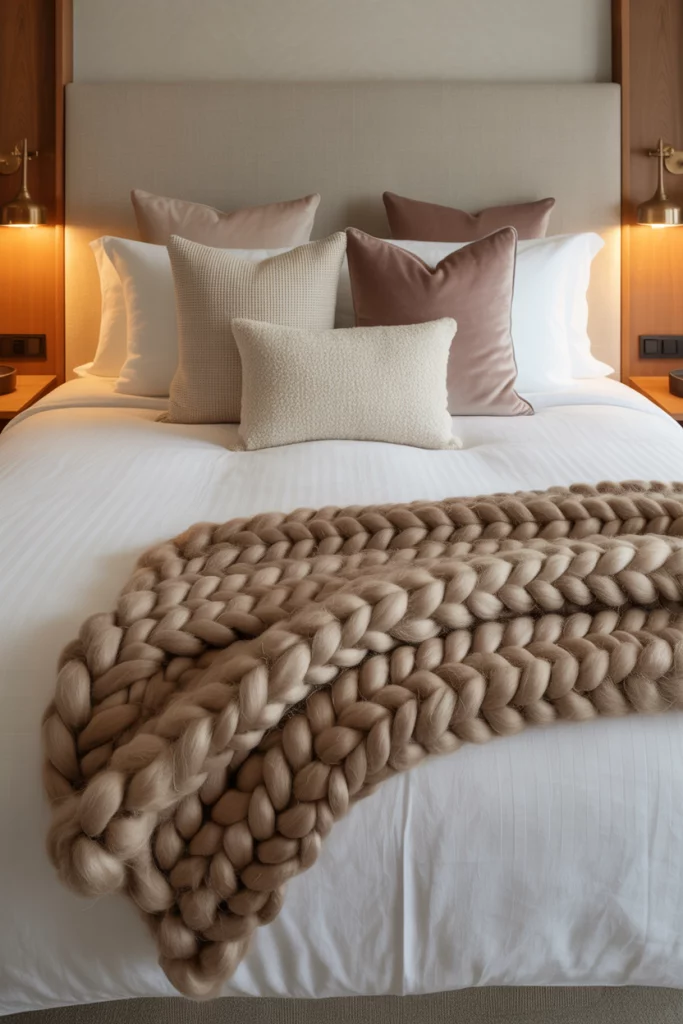 A truly cozy bedroom in 2026 relies on layers: quilt + duvet + throw + mixed pillows. Combine natural fibers like linen, cotton, and chunky wool with tailored edge stitching to keep it luxury instead of messy. House Beautiful highlights that the hotel-bed look is trending, but now with relaxed European folds instead of perfect military corners.