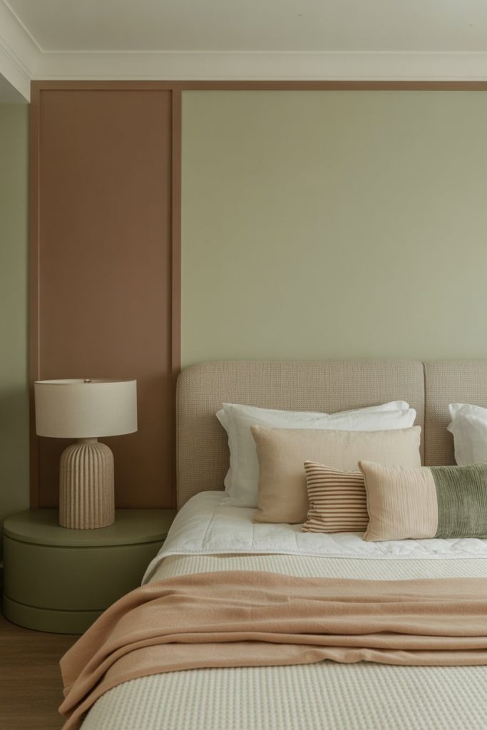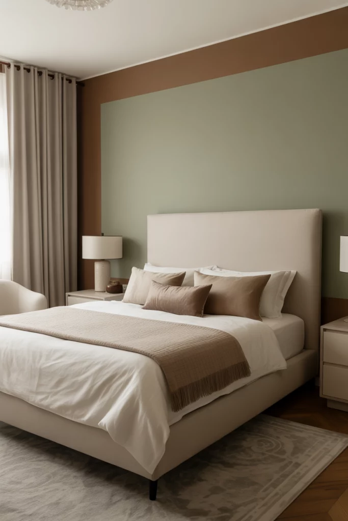 A sophisticated way to play with color schemes is color-blocking: one shade for the headboard wall, another for trim, and a third for textiles. Use muted tones like sage, mocha, and ivory for balance. This method gives personality without pattern overload and is a favorite of designer Athena Calderone for modern luxe bedrooms.