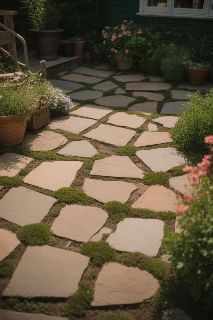 For homeowners drawn to relaxed, organic aesthetics, irregular stone flagstone creates the perfect cottage-garden atmosphere. This paving stones approach uses natural stone pieces in varying sizes fitted together like a puzzle, with gaps filled using either gravel or groundcover plants. The informal pattern suits small yard settings particularly well, as the irregular shapes create visual interest without overwhelming limited square footage.