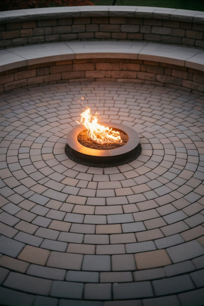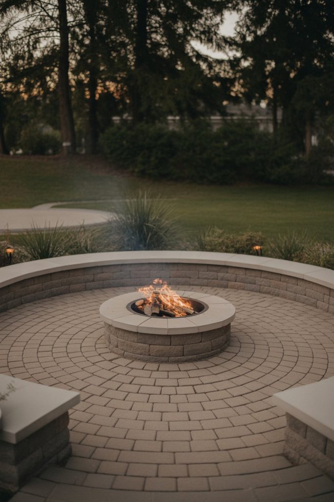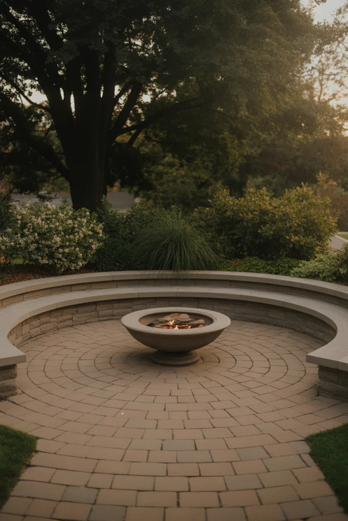 A circle pattern radiating from a central fire pit creates an inviting gathering spot that draws people together naturally. Using paving stones in concentric rings with alternating colors adds movement and visual interest, while the curved layout softens the geometric lines of typical rectangular yards. This design has become increasingly popular in Midwestern backyards where outdoor fire features extend the usable season well into fall.