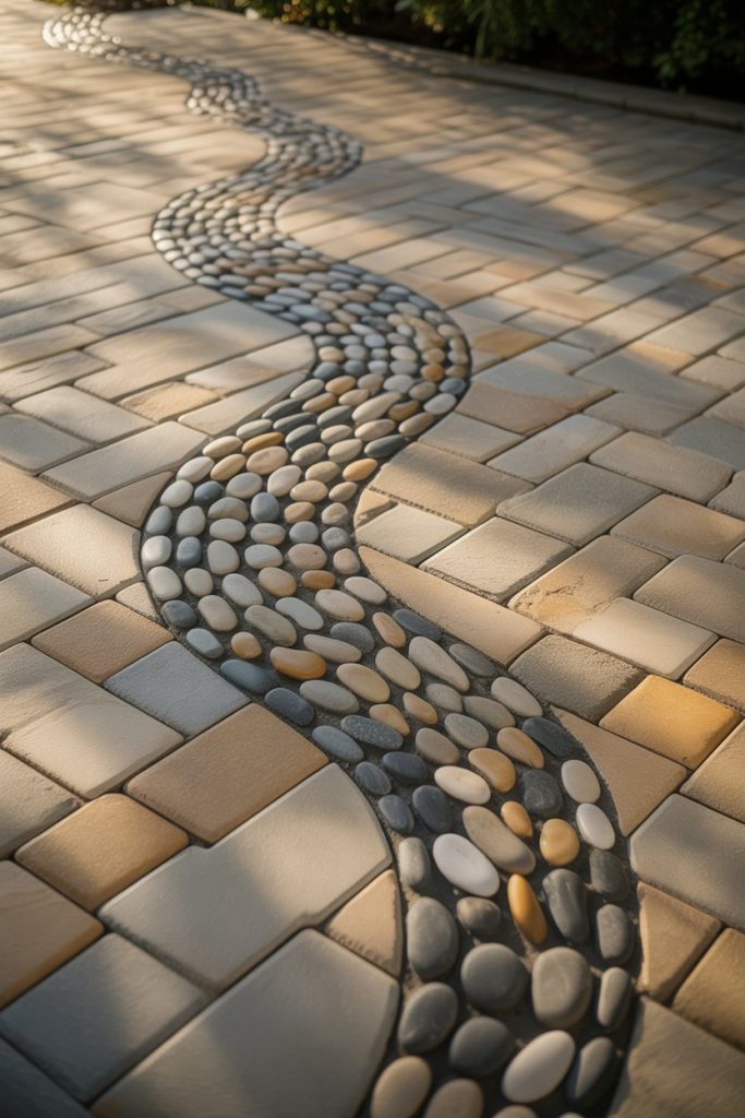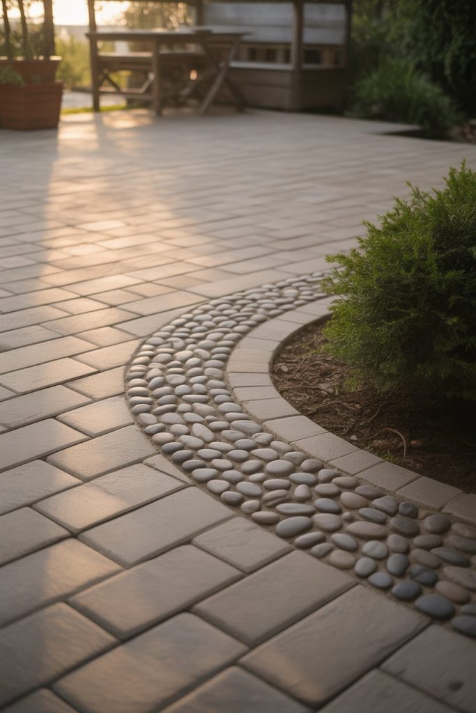 Incorporating pebble mosaic borders into your layout adds artisanal character that elevates the entire patio design. This technique involves setting smooth river rocks in decorative patterns along edges or as medallion inserts within the main paver field. The contrast between smooth pebbles and geometric pavers creates textural richness that photographs beautifully—exactly what Pinterest-browsing homeowners crave.