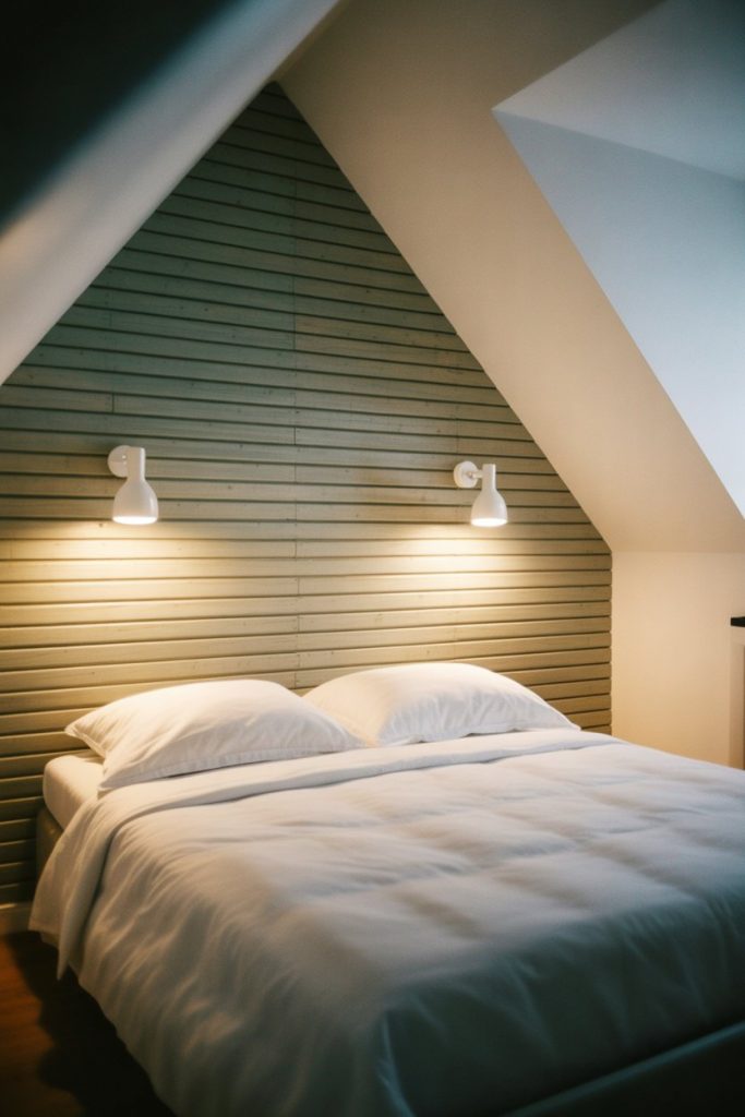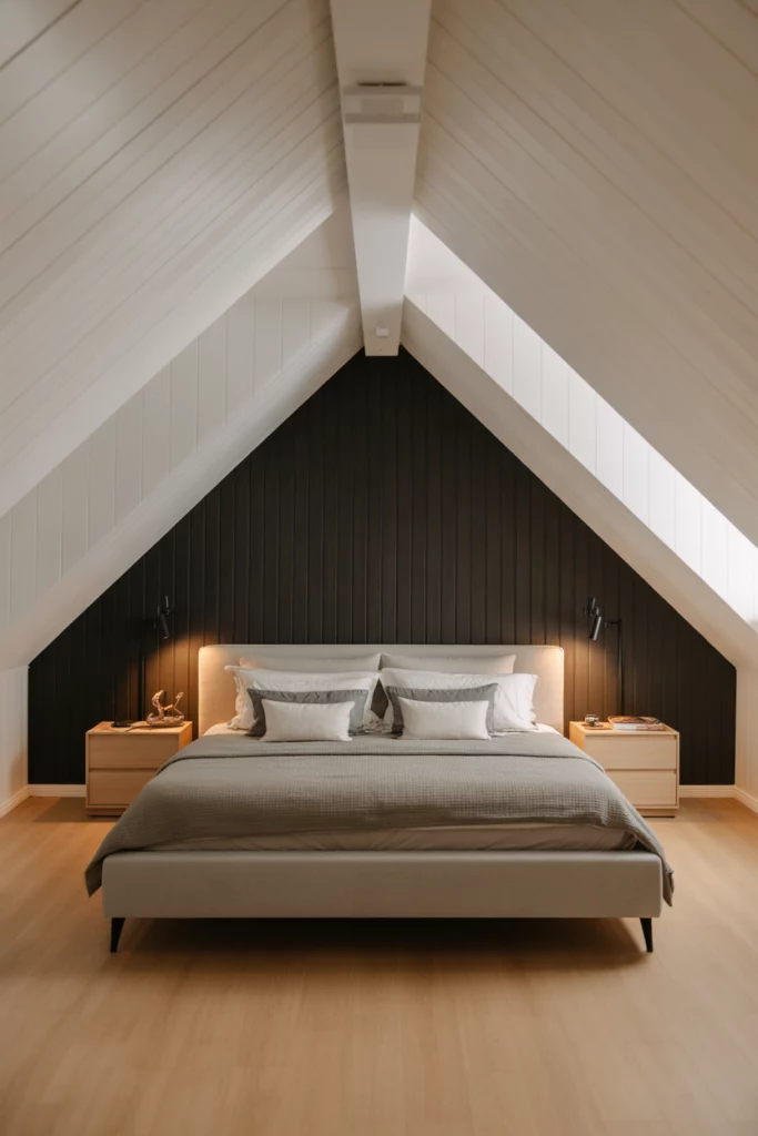 Instead of fighting against slanted ceilings, let them define the room’s character. Paint them in a contrasting color or use wood paneling to draw the eye upward and create visual interest. This approach works especially well in attic bedroom ideas master suites where you want a sophisticated, intentional look. The angles add architectural drama that flat ceilings simply can’t match, and when you lean into them rather than hide them, the space feels purposefully designed rather than compromised.
