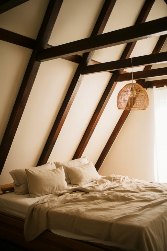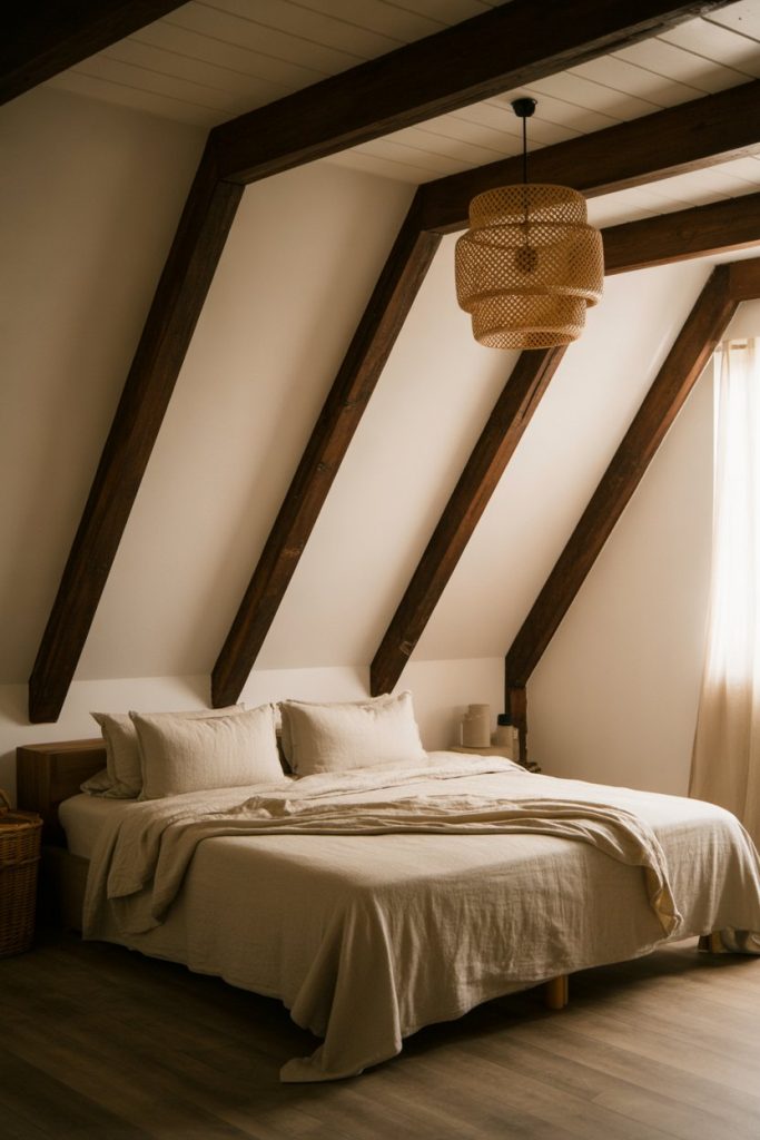 If your attic has structural beams, exposing them adds instant character and warmth. Leave them natural wood or paint them to match your palette—either approach works. The beams provide visual breaks that make slanted ceiling interior design more interesting, and they give you convenient spots to hang plants, artwork, or lighting.