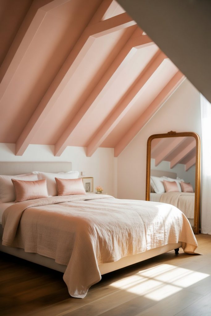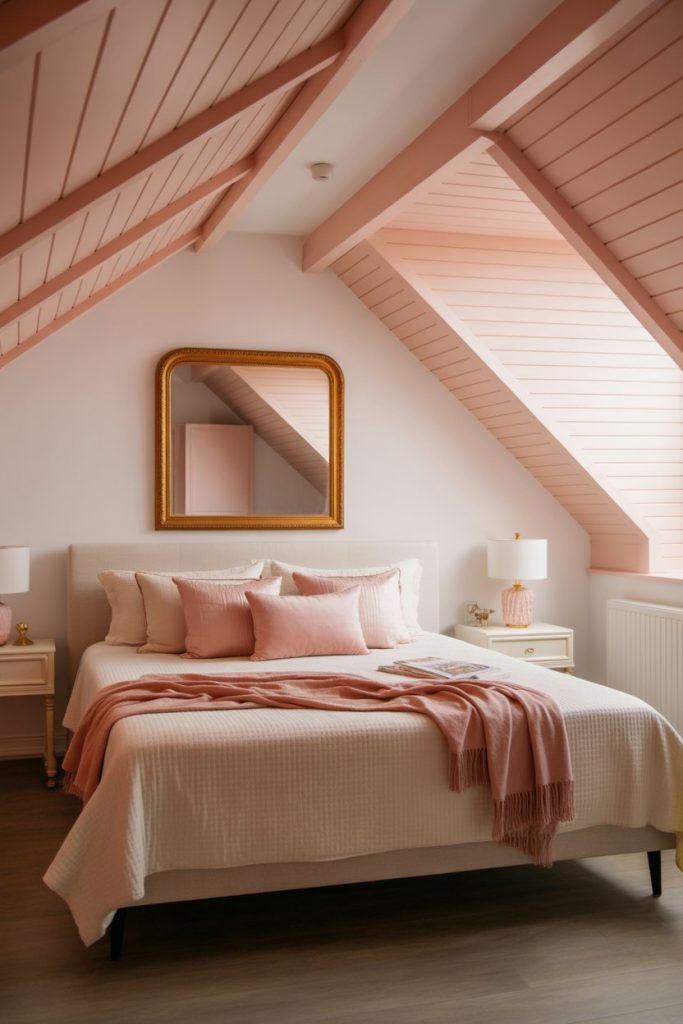 A pink attic bedroom doesn’t have to feel juvenile—dusty rose, blush, or terracotta pinks create a sophisticated, warm atmosphere. Use pink on textiles, artwork, or a single painted slope while keeping the rest of the palette neutral. This approach works beautifully in cute spaces that want to feel grown-up and intentional rather than overly sweet.