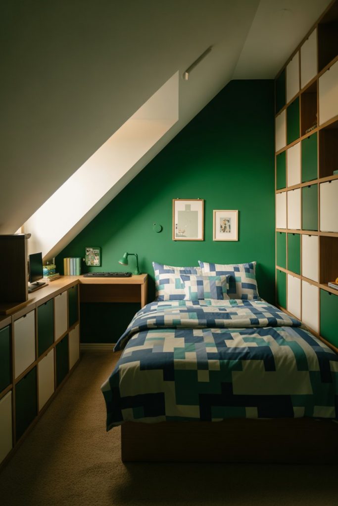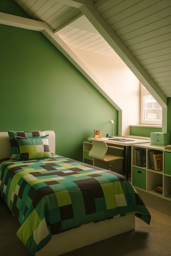The blocky, geometric nature of Minecraft aesthetics actually suits attic architecture surprisingly well. Use the triangle shapes created by sloped ceilings as part of the design language, incorporate pixelated patterns in bedding or wall art, and add LED strips for that gaming setup glow. Kids who love the game will appreciate the themed space, and the geometric approach keeps it from feeling too literal or babyish.