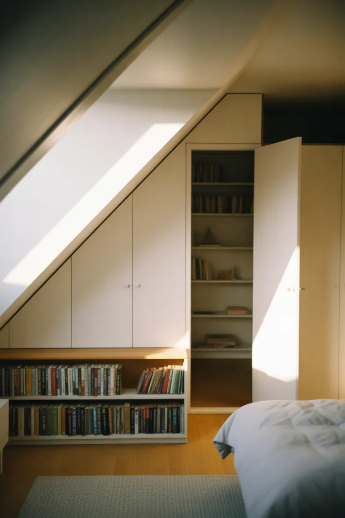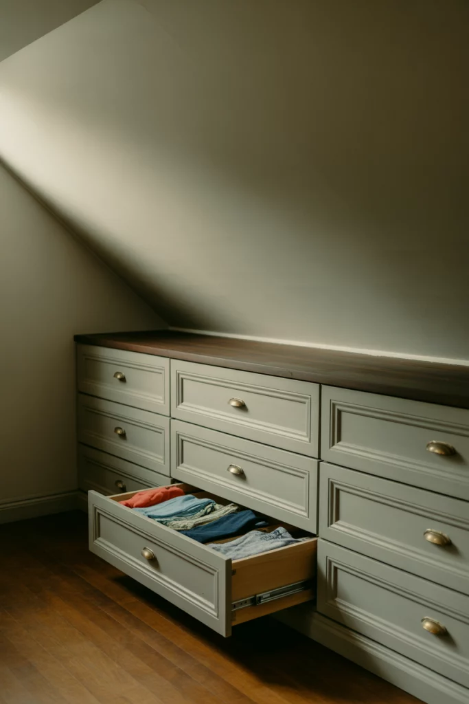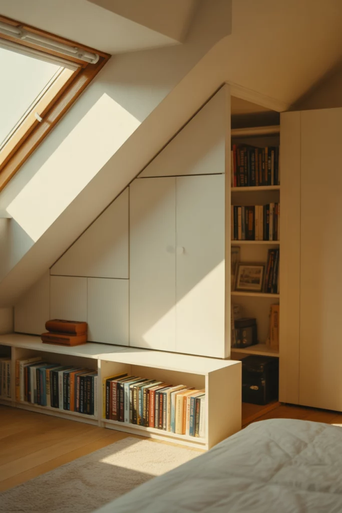 Many attics have half-height knee walls where the roof meets the floor. Instead of treating these as problems, use them to your advantage. They’re perfect for low bookcases, radiators, or built-in benches. The space behind them can become valuable storage accessed through small doors or drawers. This is especially useful in tiny bedrooms where maximizing every dimension matters.