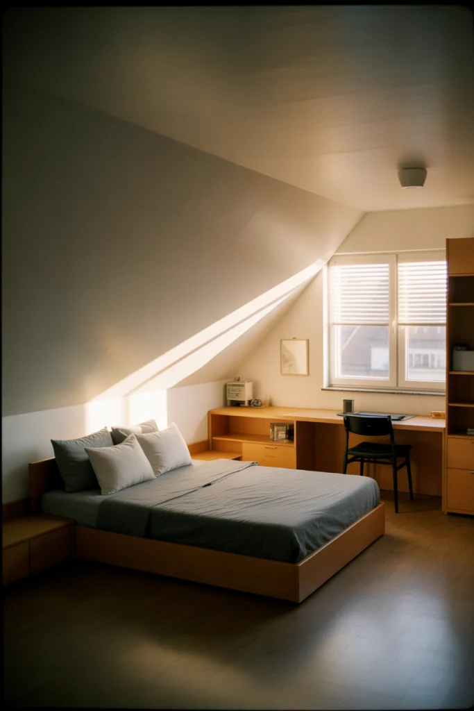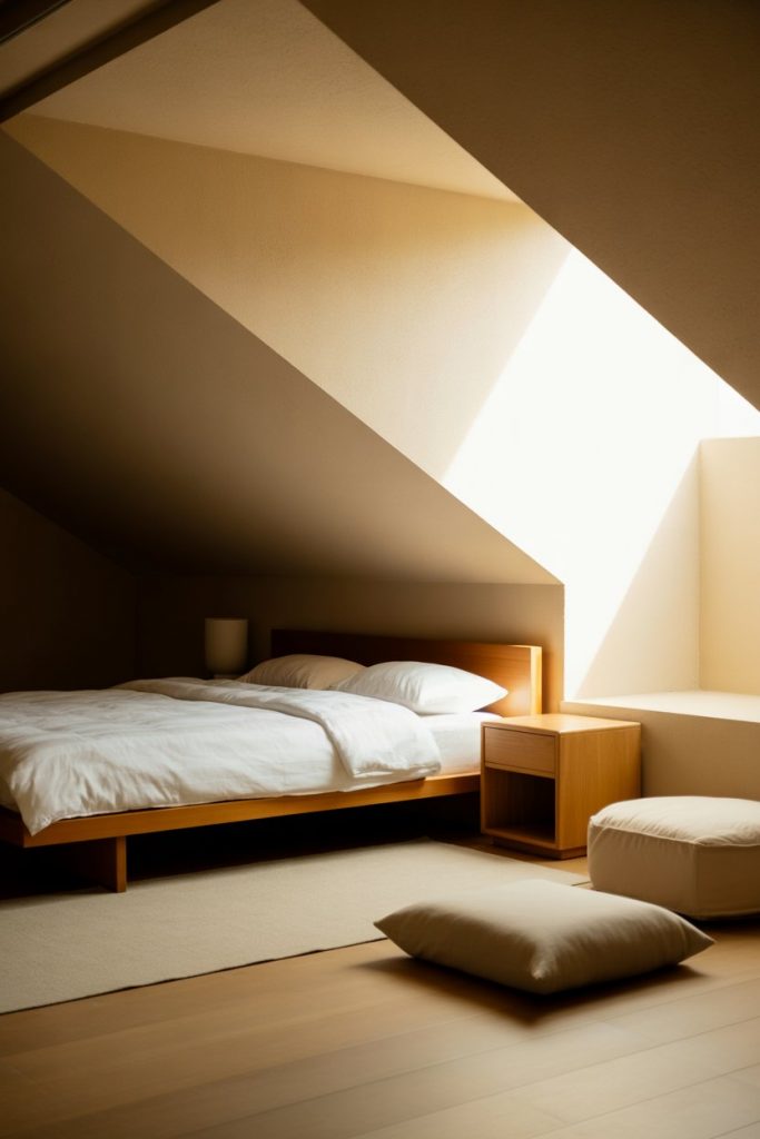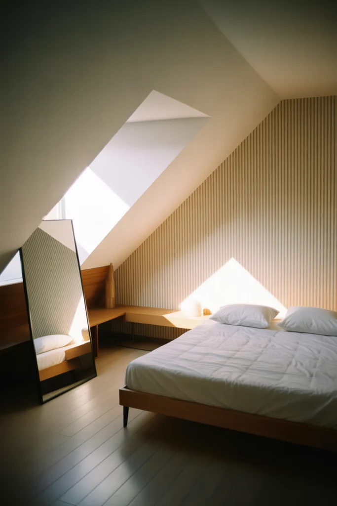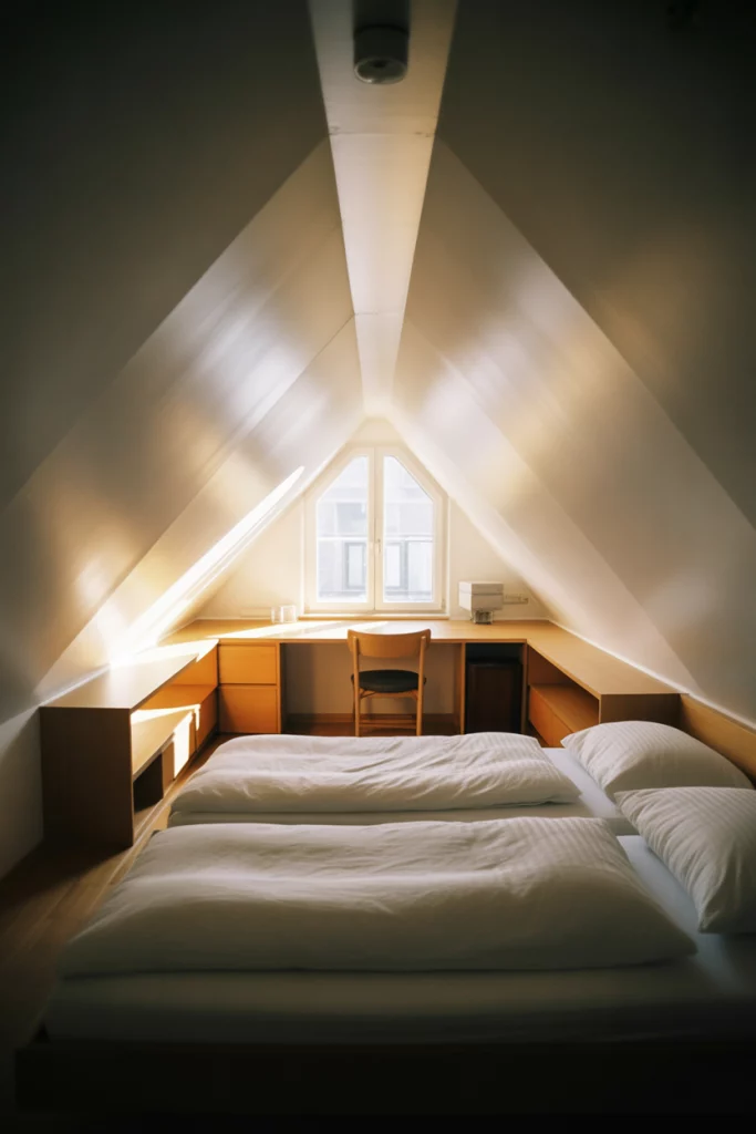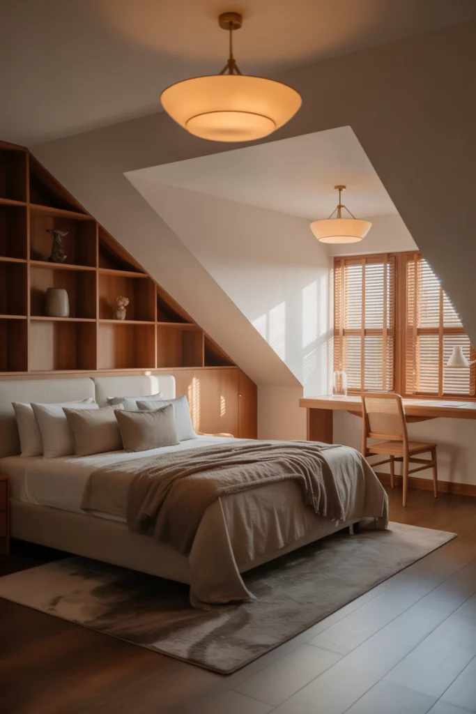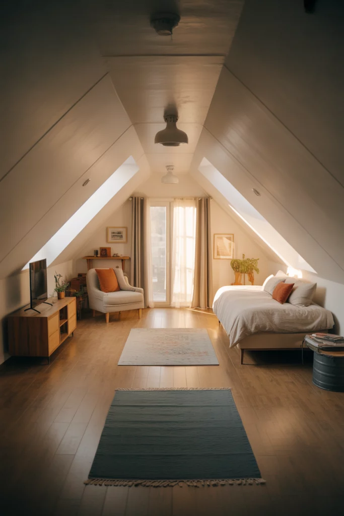 A half attic—where only part of the floor has adequate ceiling height—requires thoughtful furniture placement. Put the bed and other low-use areas (storage, occasional seating) under the lowest sections, and reserve the tall areas for standing activities like dressing or moving around. This maximizes usable space without requiring expensive structural changes.