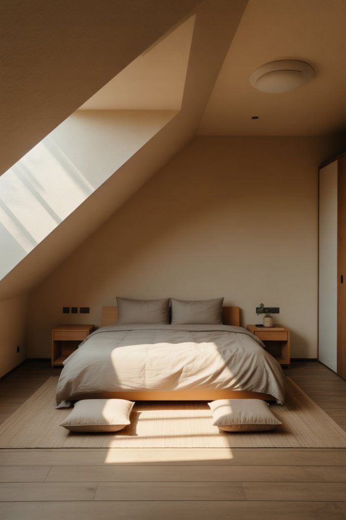 In attics with genuinely low ceiling sections, choose platform beds, floor cushions, and low-slung seating that doesn’t fight the vertical limitations. This Japanese-inspired approach makes the room feel intentionally minimal rather than accidentally cramped, and it actually uses the space more effectively because you’re not wasting vertical inches on tall furniture legs and frames.