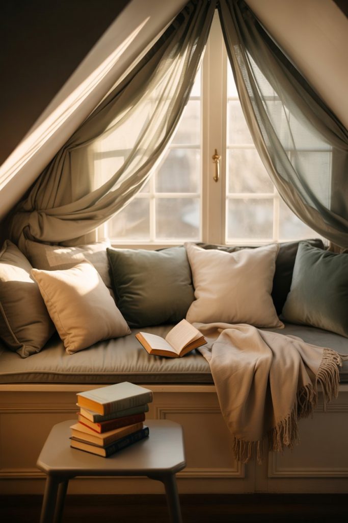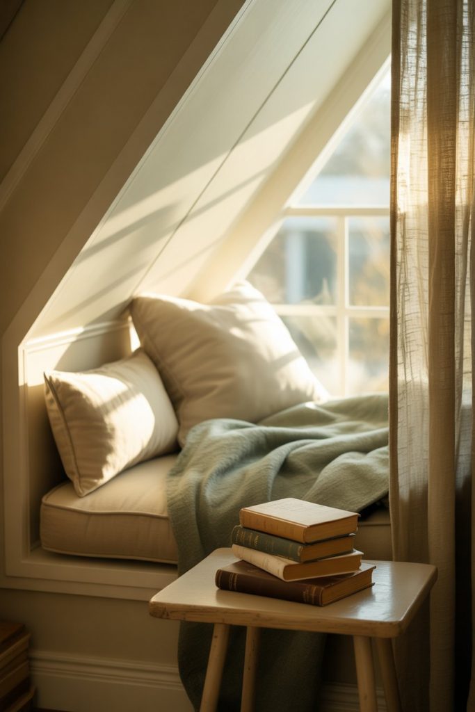 The low ceiling areas that feel awkward for standing become perfect for sitting. Build in a window seat or place a floor cushion where the roofline dips lowest, and you’ve got an instant retreat within a retreat. This works beautifully in cozy attic bedrooms where maximizing every square foot matters, and it gives you a designated spot that feels separate from the sleeping area without requiring walls.