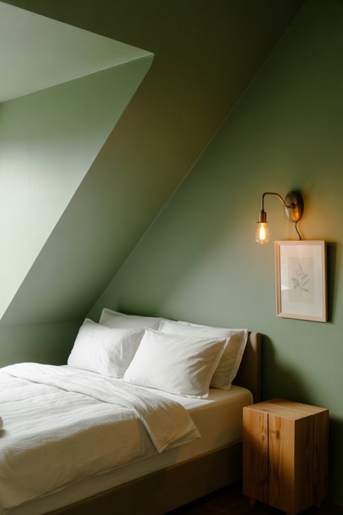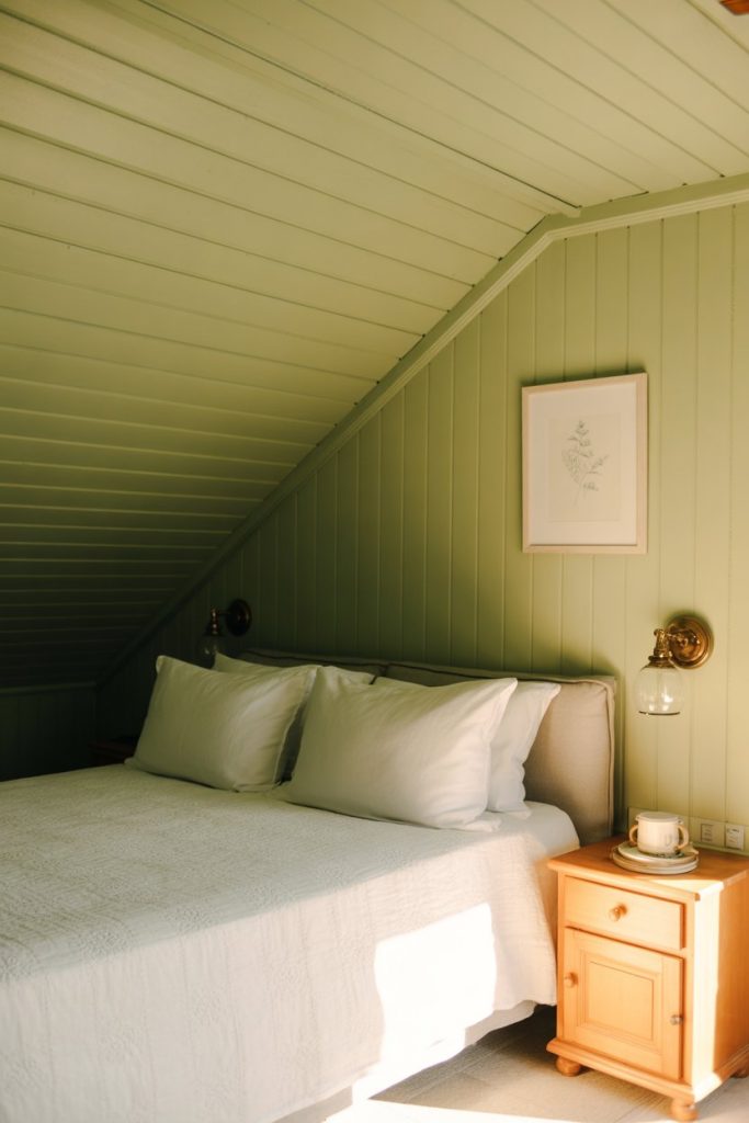 Don’t default to white just because the ceiling slopes. Angled ceilings paint colors in deep blues, warm terracotta, or even charcoal can make the room feel wrapped and intimate rather than choppy. When you paint the ceiling the same color as the walls, you eliminate the visual breaks that make low spaces feel smaller, and instead create a cohesive envelope that actually feels more spacious.