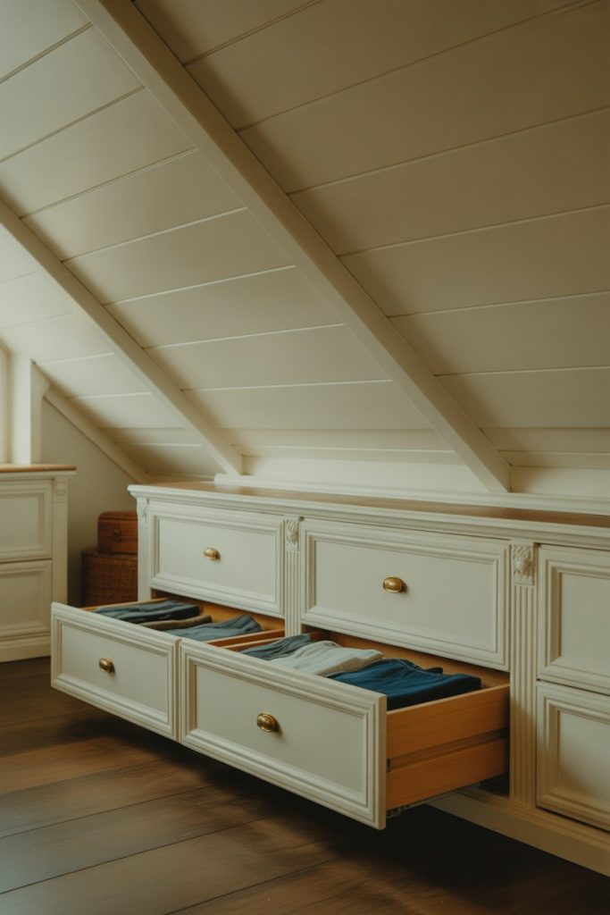 The unusable space under slanted rooflines is actually prime real estate for custom storage. Built-in drawers, cabinets, or open shelving that follows the slope turns wasted square footage into highly functional organization. This is especially valuable in tiny attic bedrooms where every inch counts and freestanding furniture would create awkward gaps.
