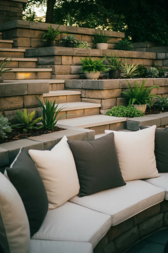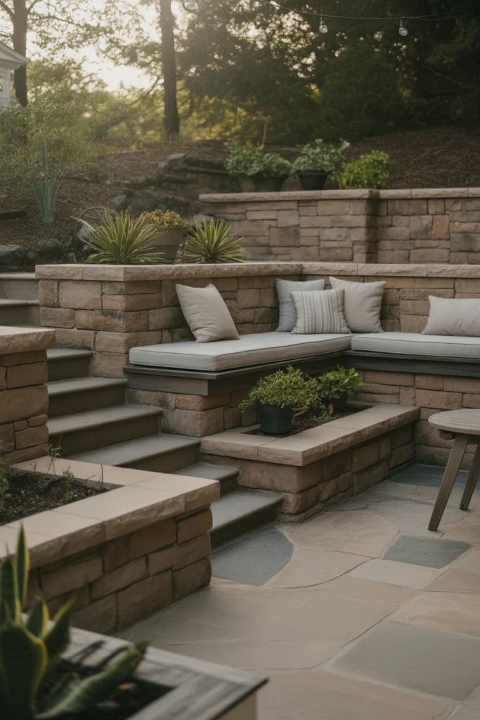A sloped backyard doesn’t have to limit your outdoor entertaining options. Tiered stone patios create distinct zones for dining, lounging, and grilling while managing elevation changes naturally. This layout works beautifully in hilly regions like California’s Bay Area or the Pacific Northwest, where homeowners want to maximize usable space without extensive grading. Flagstone or bluestone steps connect each level, and built-in bench seating along the retaining walls eliminates the need for bulky furniture.