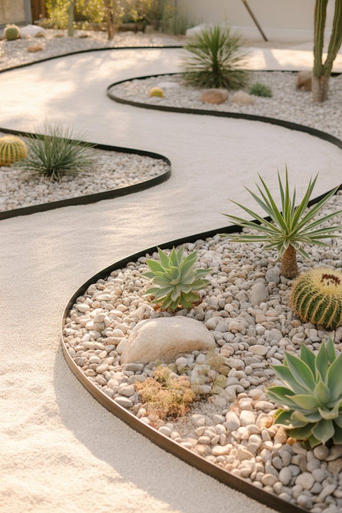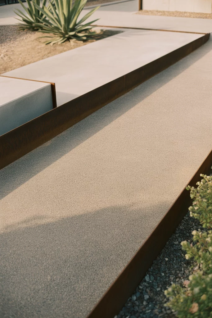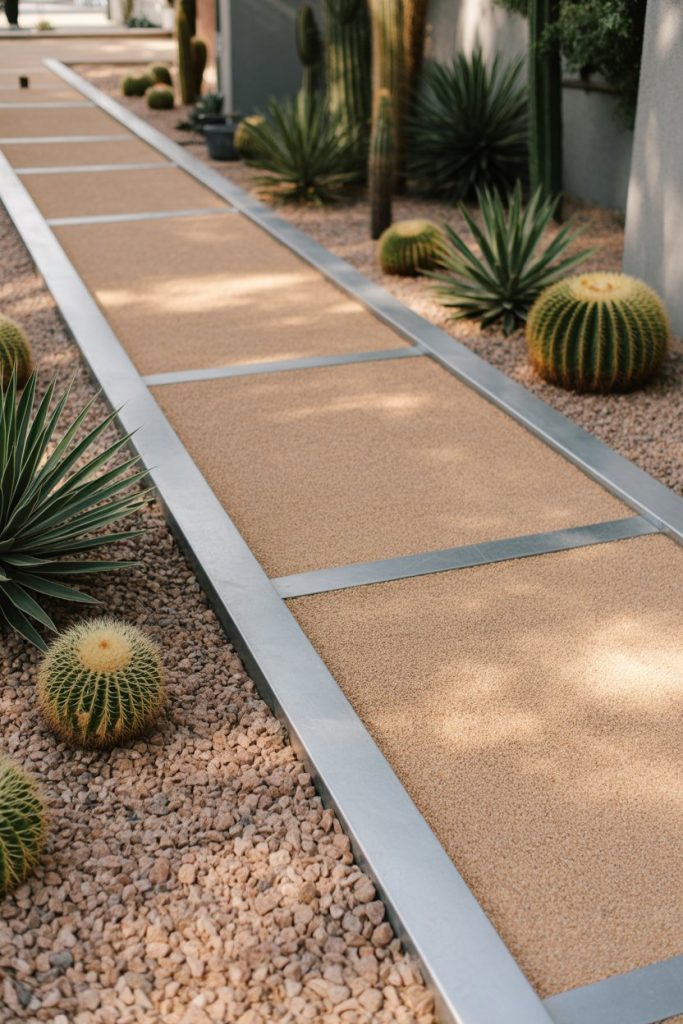 Decomposed granite (DG) creates firm, permeable pathways that blend seamlessly into contemporary and desert-style landscapes. Choose stabilized DG, which includes a natural binder that hardens when compacted and watered, preventing the dusty, loose texture of untreated material. Edge paths with quarter-inch steel or aluminum strips for clean, modern lines that prevent the DG from migrating into planting beds. This simple treatment works beautifully in arid climates where traditional concrete feels harsh and lawn paths require constant upkeep.