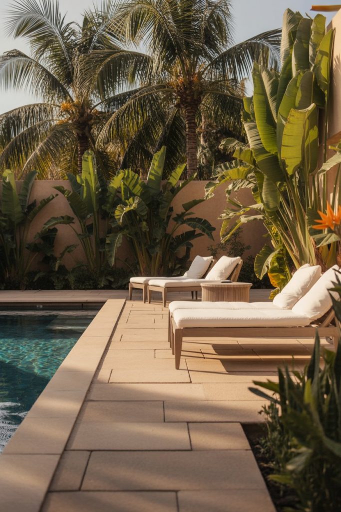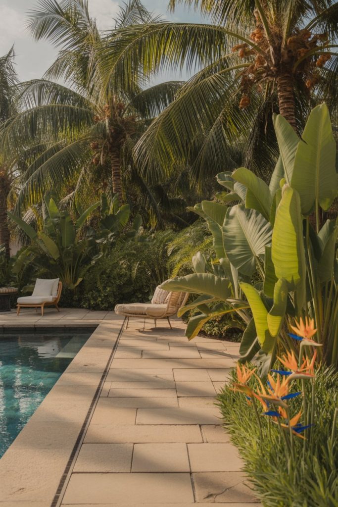 Transform a standard swimming pool area into a resort-style retreat by layering tropical plantings around the deck. Mix several palm varieties—queen palms for height, sago palms for mid-level structure, and clustering bamboo palms for lush texture—with broad-leafed companions like elephant ears and bird of paradise. Use large-format porcelain pavers in warm earth tones for the deck surface; they stay cooler than concrete and resist pool chemical staining. Add a sail shade or pergola over the lounge area to create pockets of shade. This tropical aesthetic thrives in humid climates like Florida, the Gulf Coast, and Southern California.
