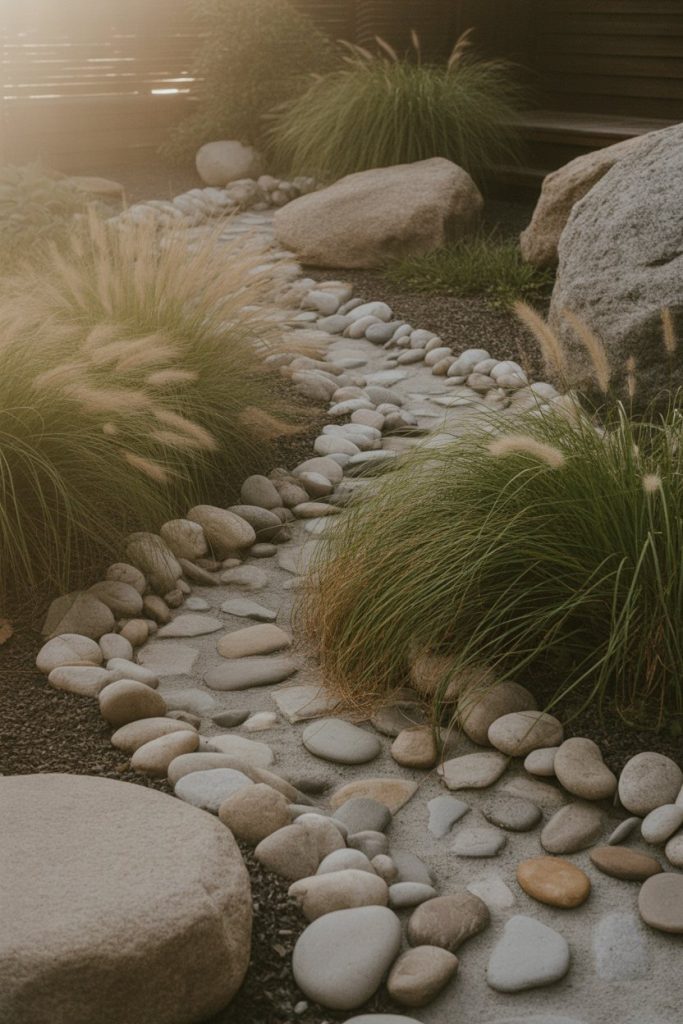 A dry creek bed solves drainage problems while adding natural texture to the landscape. Excavate a gently curving channel following your yard’s natural water flow, line it with landscape fabric, then fill it with river rocks in graduated sizes—larger boulders at the edges, smaller cobbles in the center. Plant the banks with moisture-tolerant perennials and ornamental grasses that can handle occasional flooding. During heavy rains, water flows through the channel; the rest of the time, it reads as an attractive landscape feature. This technique works beautifully on sloped properties where runoff erodes soil or creates muddy channels.