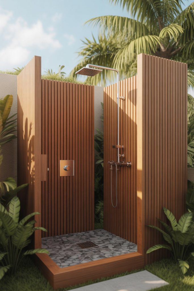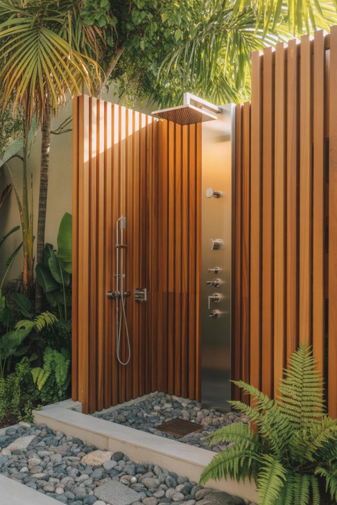 An outdoor shower extends your home’s functional space while adding a luxury resort element to the backyard. Build a simple enclosure using vertical cedar slats spaced an inch apart for privacy and airflow, then install a basic hot/cold shower valve plumbed from your home’s water supply. Add a teak platform or decorative river rock floor for drainage. This feature is especially practical near swimming pools or in coastal homes where sandy feet and wet swimsuits are daily realities. Position the shower where it gets afternoon sun for naturally warmed rinses and quicker drying.