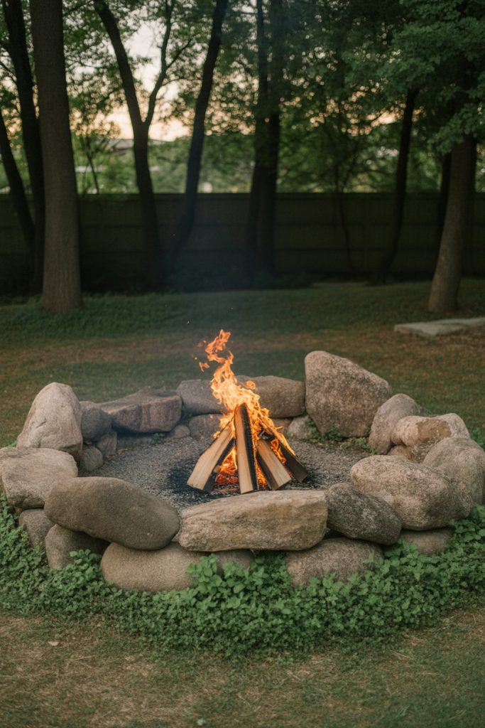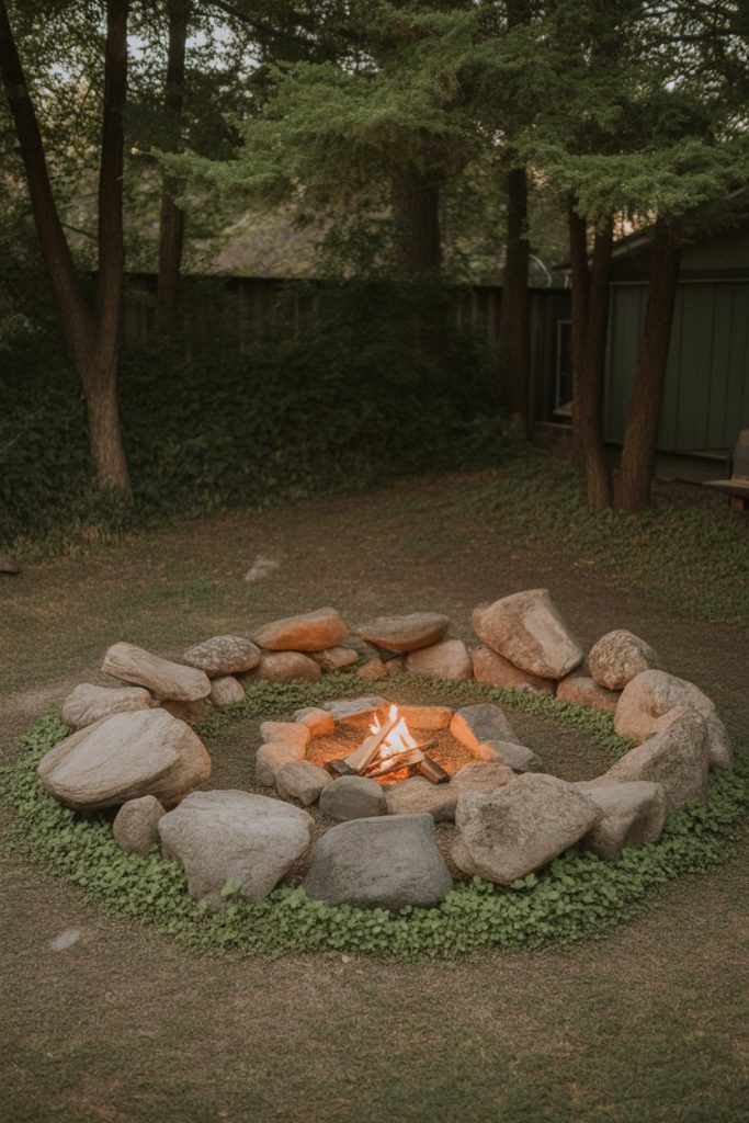 Where this works best: rural or suburban lots with mature trees where you want a gathering spot that feels secluded and connected to nature. Boulders large enough for seating (three to four feet across) are heavy—you’ll need equipment to position them unless you’re willing to work with a landscaper who has the necessary machinery. Many stone yards sell boulders by the ton ($100–250 per ton), and a typical seating circle requires four to eight tons depending on boulder size and circle diameter.