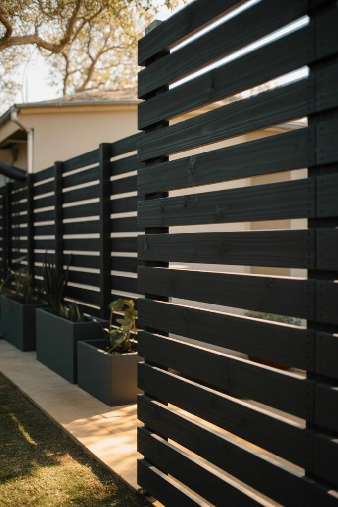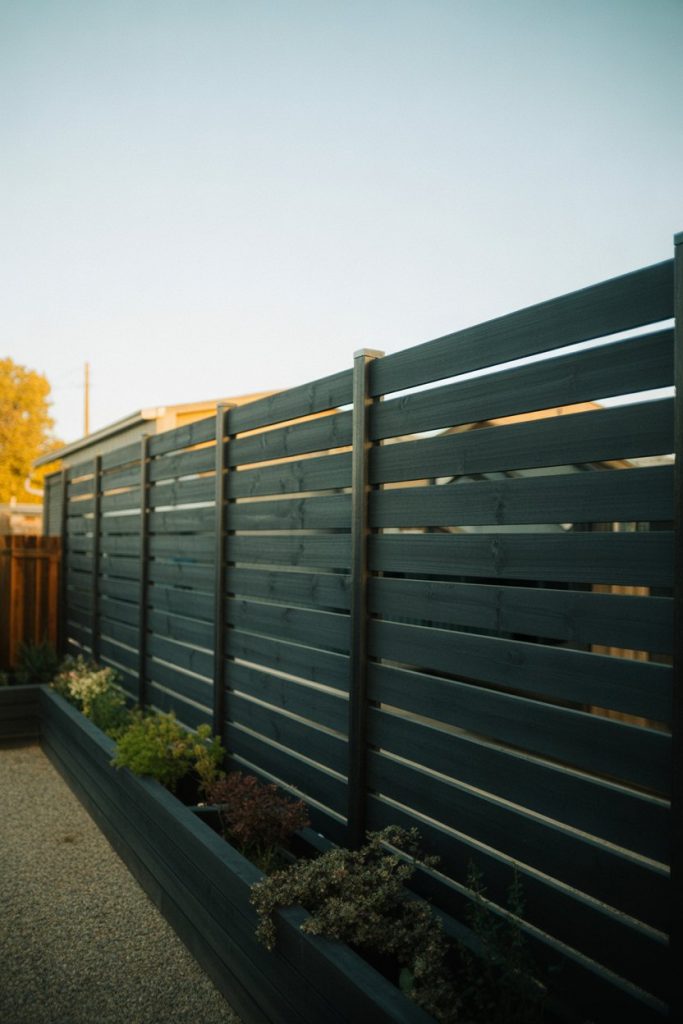 Horizontal fence slats deliver clean, contemporary curb appeal that’s become hugely popular in modern and mid-century neighborhoods. Use one-by-six cedar or composite boards with quarter-inch gaps between each slat, attaching them to vertical posts every six to eight feet. The horizontal orientation makes yards feel wider and creates interesting shadow patterns throughout the day. Stain the fence a warm charcoal or leave cedar natural to silver over time. This design works particularly well in urban settings where you want privacy without the closed-in feeling of solid panels.