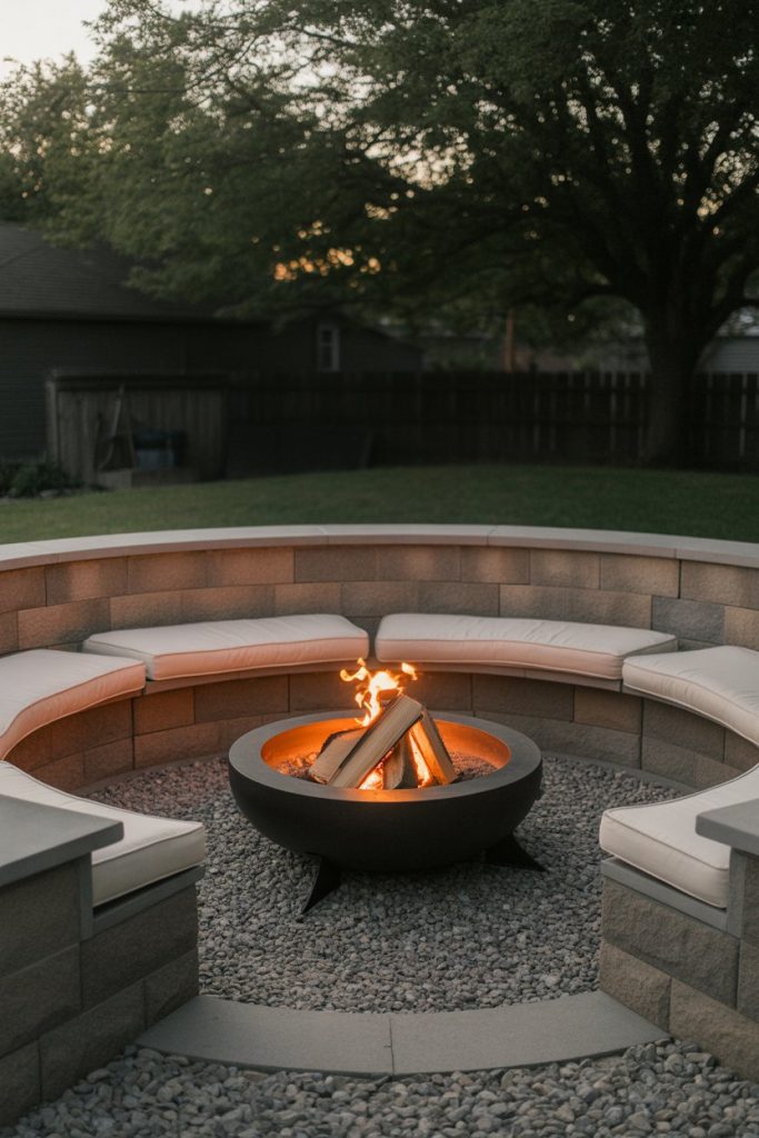 A sunken fire pit creates an intimate gathering spot that feels sheltered from wind and neighbors’ sightlines. Excavate eighteen to twenty-four inches below grade, then line the pit with stacked stone or poured concrete walls that double as bench seating. This design works exceptionally well on flat lots where you want to add dimension without building upward. Add thick outdoor cushions in weather-resistant fabrics, and you’ve got a conversation area that accommodates eight to twelve people comfortably.