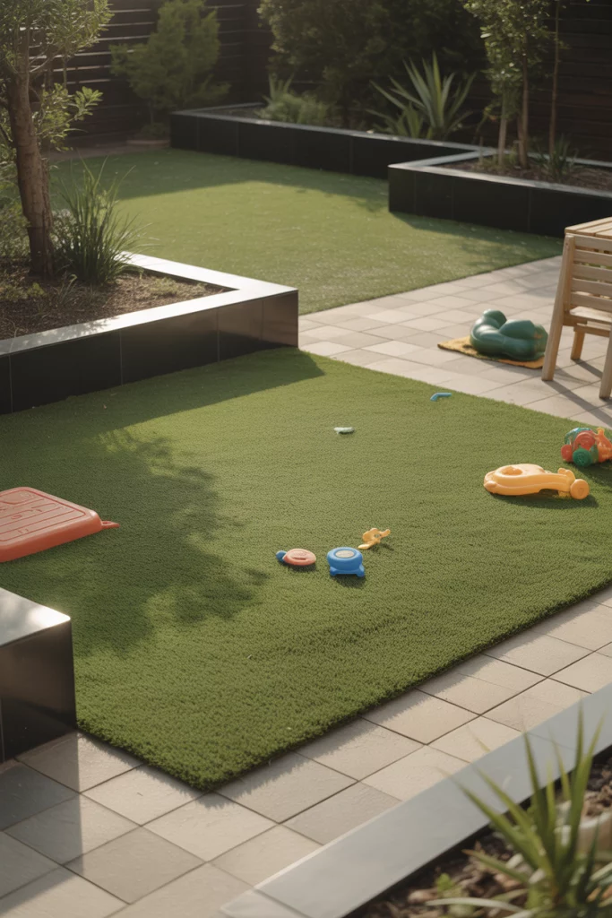 For families with active kids or energetic dogs, a dog friendly artificial turf area provides a clean, mud-free play surface that drains quickly after rain. Modern turf products look remarkably realistic and include antimicrobial backing to prevent odors. Install it over a base of crushed rock and decomposed granite, with shock-absorbing foam padding underneath if young children will be playing there. Edge the turf with flexible plastic bender board or aluminum strips to keep it secure. This solution is especially popular in California drought-affected regions where water restrictions make natural grass impractical.