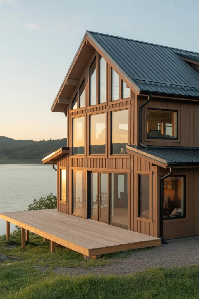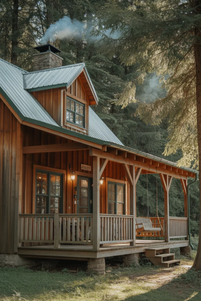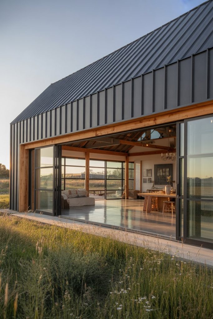 This idea captures warm cabin-like tones inside a steel shell. Rustic interiors and reclaimed wood ceiling beams add an intimate, warm feeling to the space. The exterior is usually made of natural material or painted in colors like forest green and brown-hues allowing it to blend beautifully into a wooded area. I once stayed inside a Vermont barndo of this type. It smelled strongly of pine, seemed like an old lodge but with all the modern conveniences.