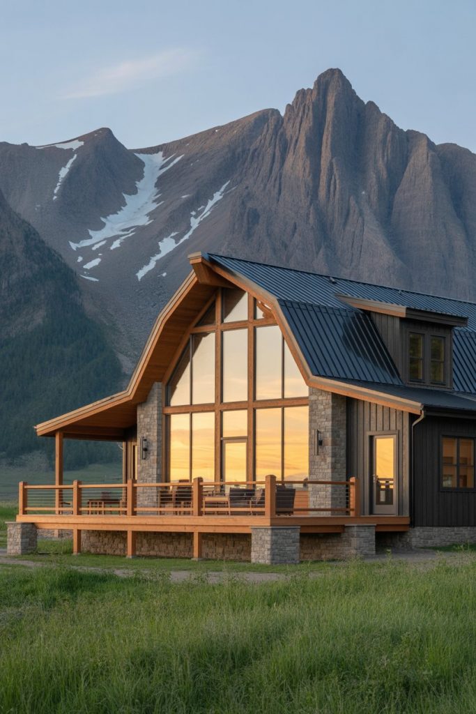 Perfect for elevated lots, this mountain-retreat-inspired barndo features natural bases of stone and warm wood interiors. Huge windows frame views well, whereas the covered porch offers an excellent outdoor getaway. The outside may be dressed up with either dark, black trims or deep tones of brown complementing the rocky environs.