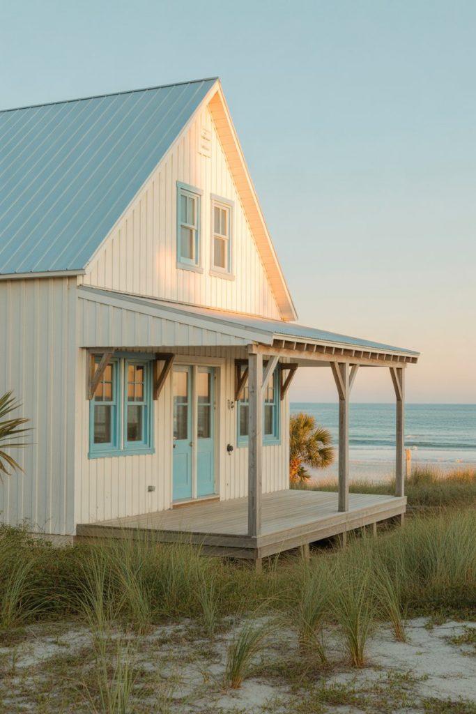 For oceanfront properties, this idea uses light exterior colors, airy interiors, and open 4 bedroom floor plans that encourage natural cross-ventilation. White walls meets blue accents and natural rattan textures for a beach feel. Perfect for relaxed coastal living, where every room feels like a sun room.