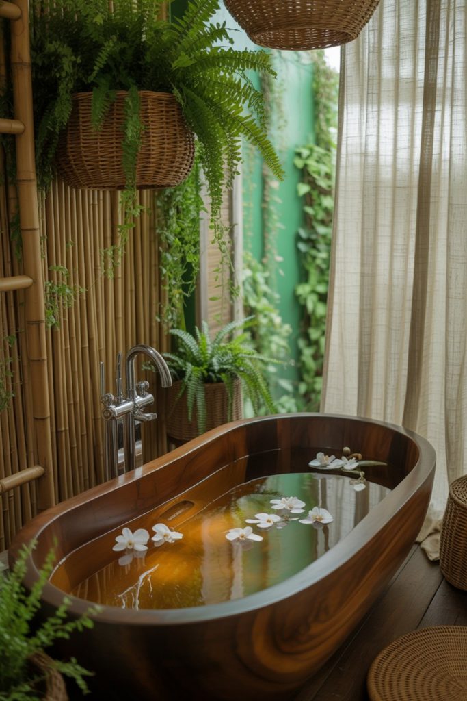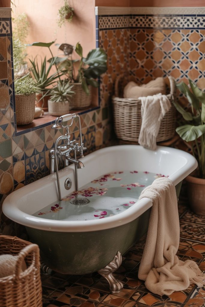 The boho love for plants makes bathrooms feel like a lush retreat. Hanging greenery, tall potted trees, and bamboo ladders for towels create a mini jungle right at home. Combined with woven baskets and patterned textiles, this approach works for renters who want to transform their apartment into a relaxing oasis. Design influencers often share that plants improve air quality, adding both beauty and wellness.