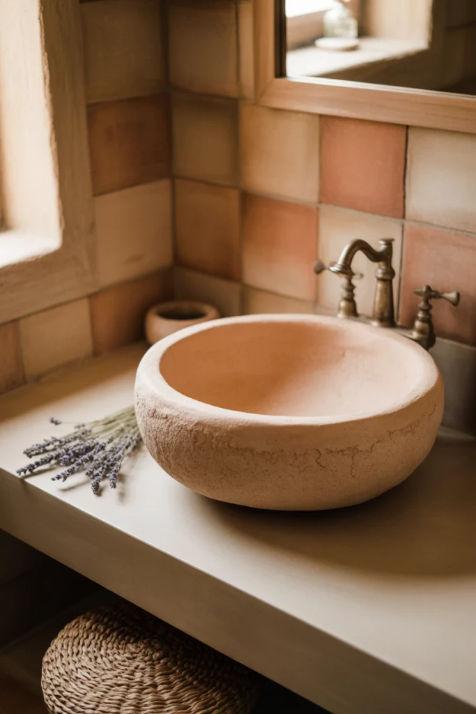 Clay and terracotta are making a comeback, bringing organic warmth into bathroom spaces. Clay tiles, textured walls, and earthy tones create a handcrafted vibe that feels timeless. This approach is particularly appealing for eco-conscious homeowners, as natural finishes emphasize sustainability. Elle Decor highlights how clay materials not only look beautiful but also create a tactile, grounding experience.
