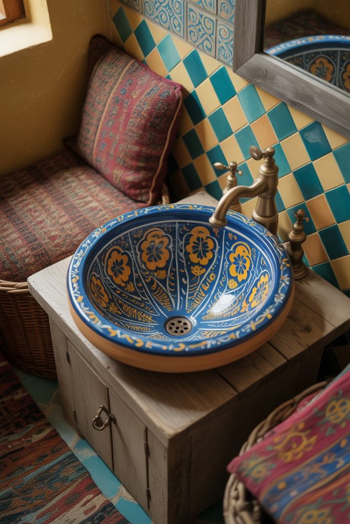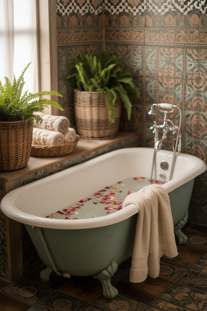 The bohemian or boho bathroom is about layering textures and patterns for an aesthetic that feels artistic and free. Think Moroccan tiles, patterned rugs, and woven baskets for storage. A mix of metals, plants, and colorful textiles creates warmth and creativity. This approach works beautifully for renters who want to personalize their space without permanent changes. Bohemian bathroom ideas have become a mainstay on Pinterest for their cute yet worldly appeal.