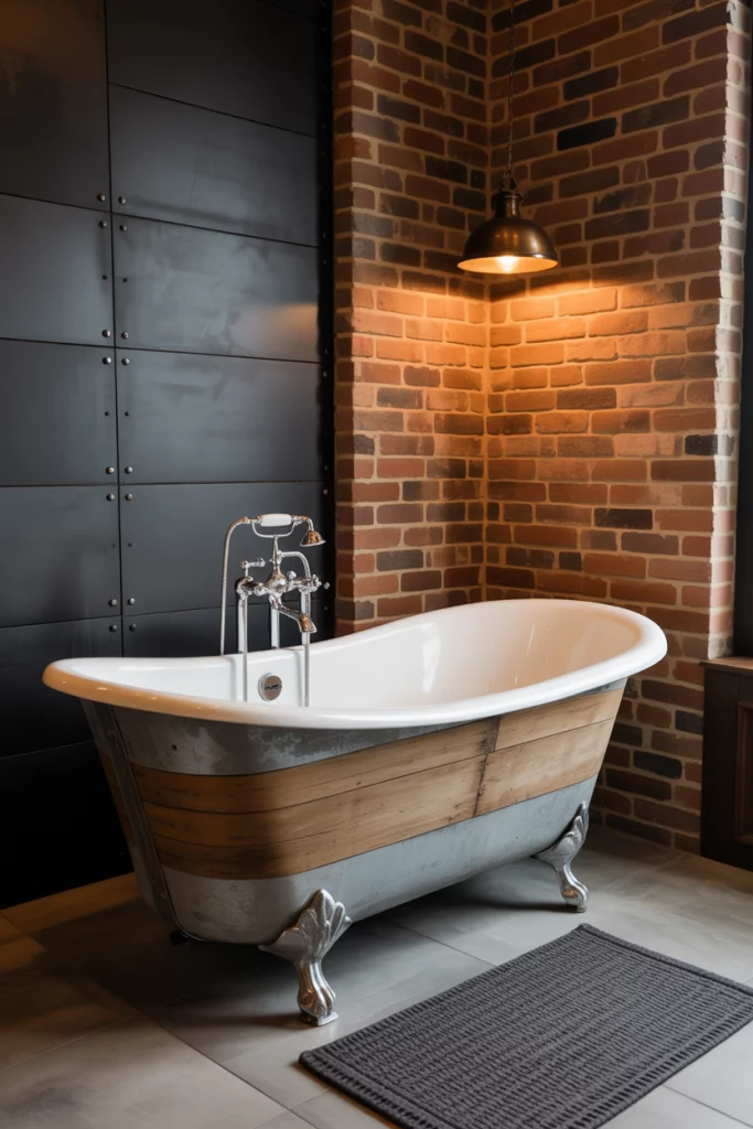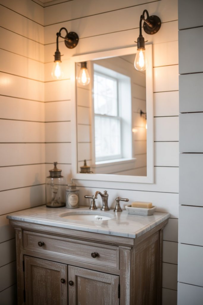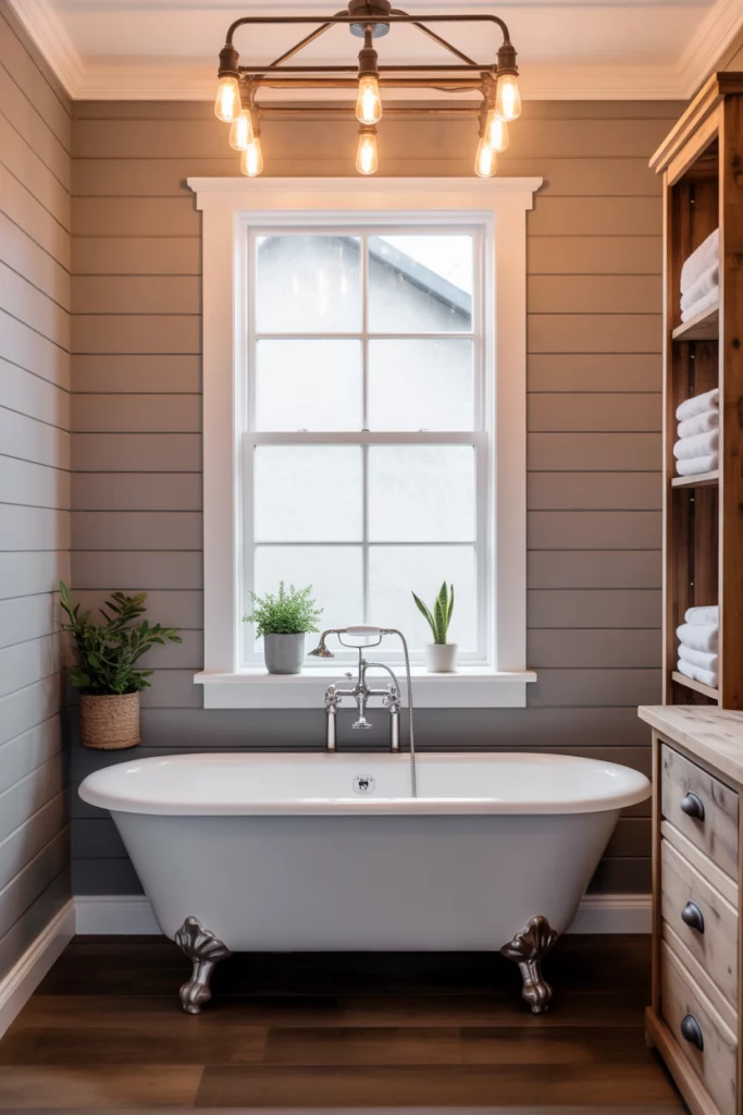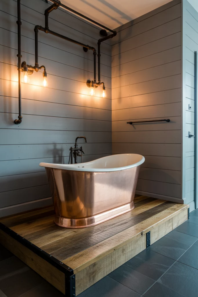 While the farmhouse trend is cozy, pairing it with industrial touches adds grit. Exposed pipes, steel mirrors, and concrete sinks mix with shiplap walls and rustic wood. This creates a balanced bathroom that feels both grounded and fresh. Ideal for city lofts or renovated barns, this style combines warmth with modern toughness. Experts at Houzz often highlight farmhouse-industrial blends as timeless yet edgy.