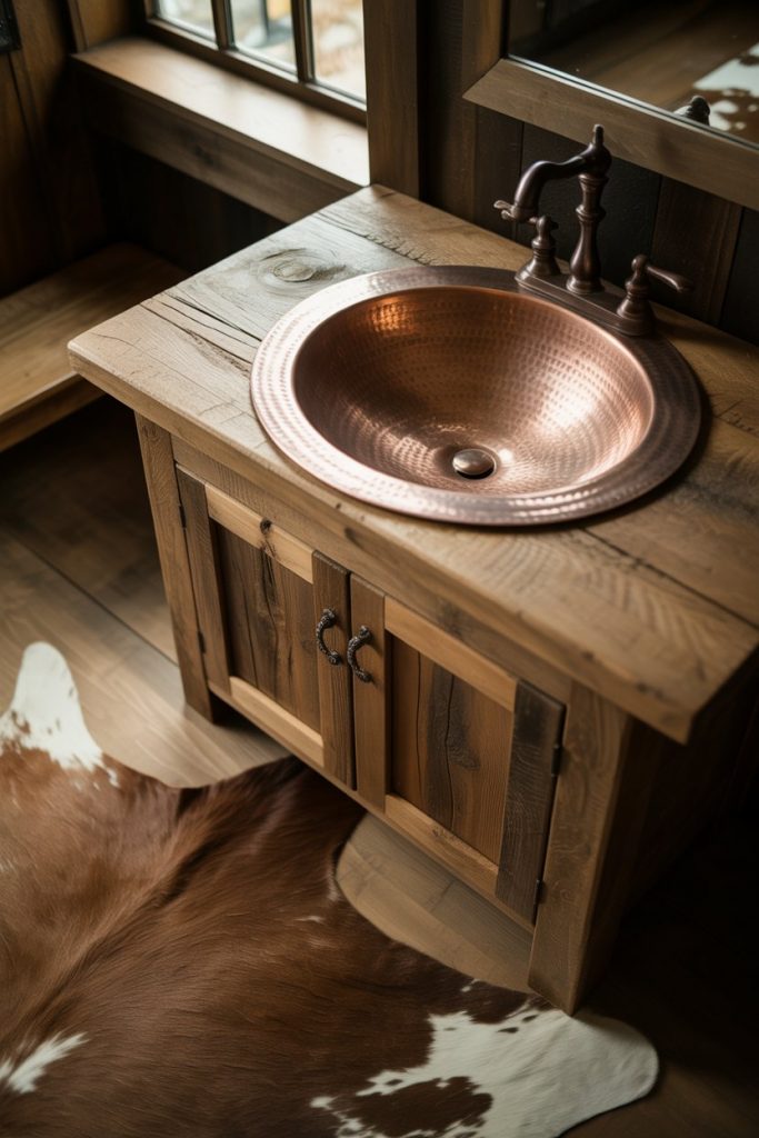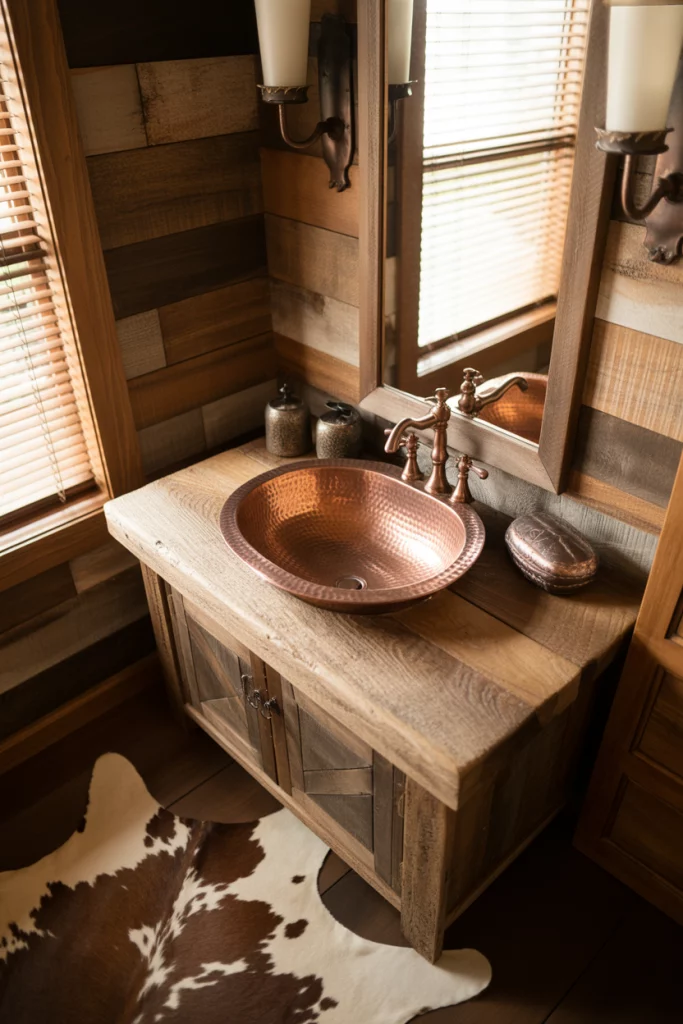In Western design, small touches like a cowhide rug or stool instantly ground a space. These accents pair well with rough wood and hammered copper sinks, giving bathrooms a rugged yet stylish vibe. This works best in larger homes or cabins, but even a guest bathroom can adopt subtle Western flair. Writers at Sunset magazine note that Western decor celebrates heritage and landscape.