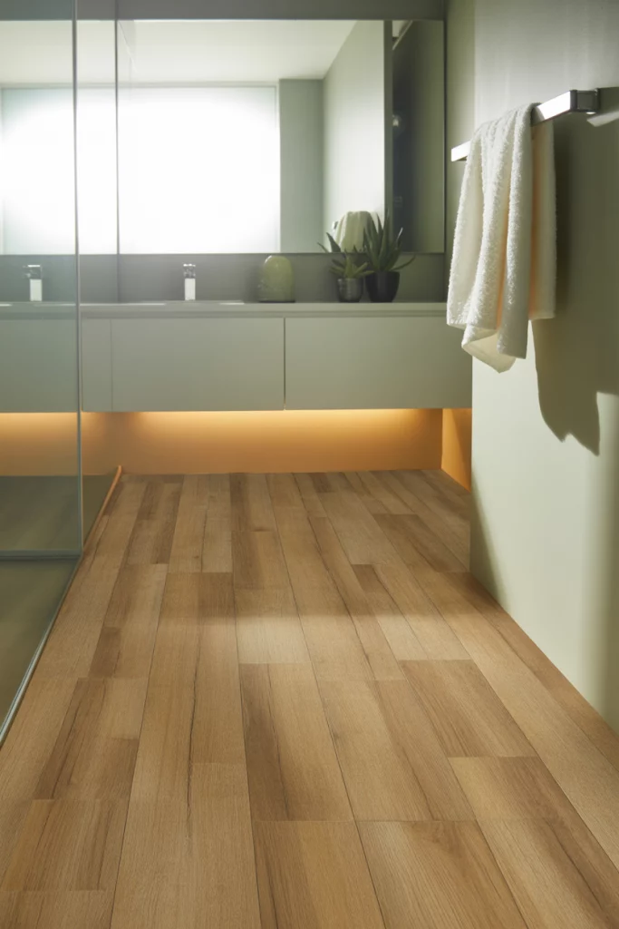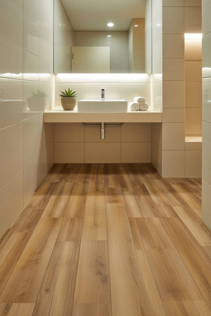 Using vinyl, waterproof vinyl, and vinyl planks makes a modern bathroom easy to maintain, especially for families dealing with splashes and busy mornings. This style fits a small bathroom, a half bath, or a rental where durability matters. Homeowners often say it feels like wood without the worry, offering warmth and comfort underfoot in everyday life.