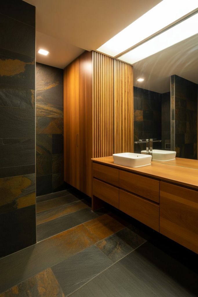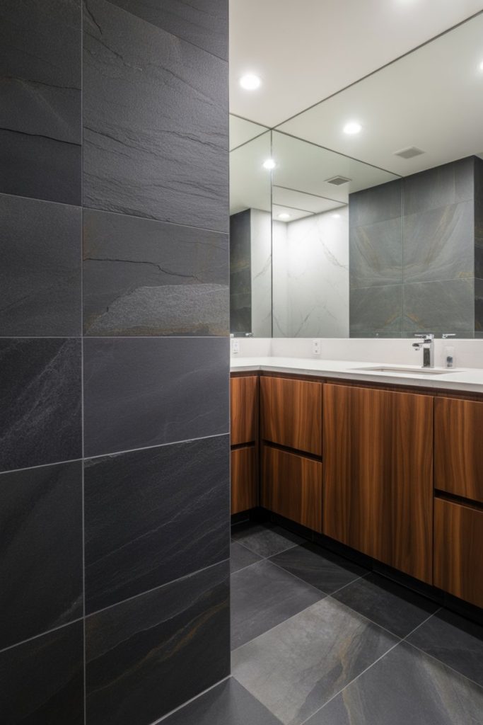 The bathroom becomes grounded and has an architectural feel when using dark stone or slates. A designer I once visited paired deep charcoal floors and natural wood, creating a space that felt rich and overwhelming. The style works in large rooms and small bathroom layouts as long as the lighting is supportive of the dark, dramatic palette.
