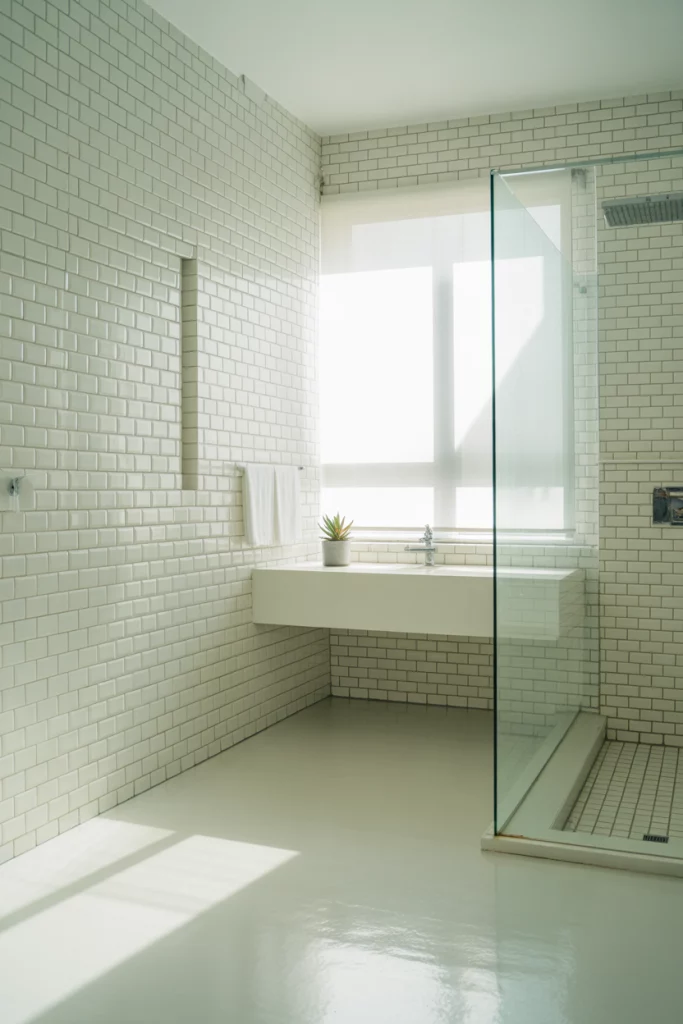 Using smooth white tile creates a clean minimalist feel that brightens even a small bathroom. Many homeowners say it reminds them of boutique hotels where mornings feel calm and orderly. This idea works well in narrow spaces, half baths, or modern remodels where light reflection matters and every detail should feel open and airy.