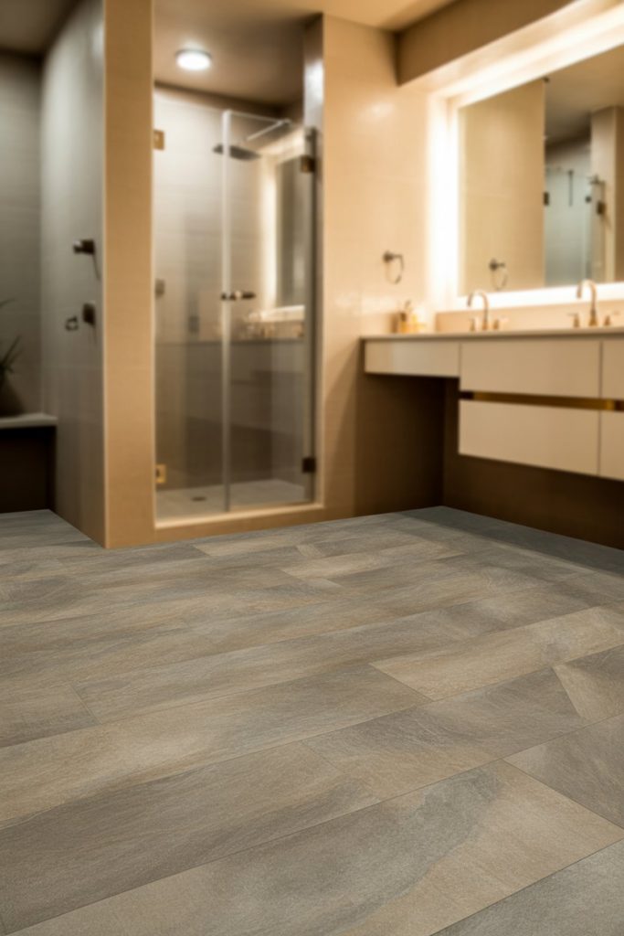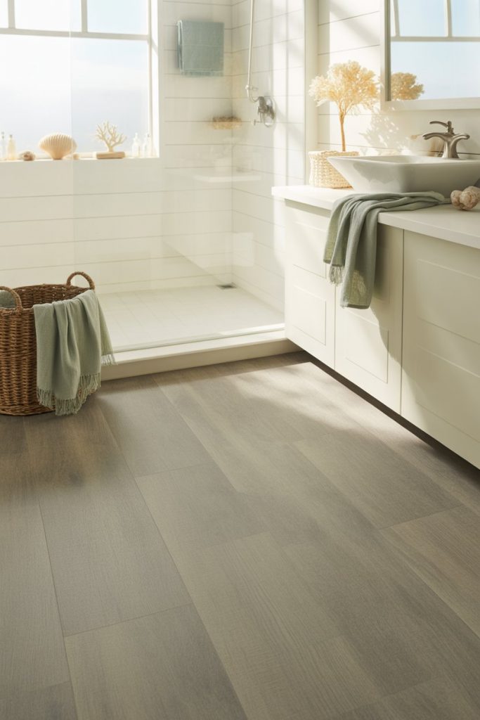 Waterproof vinyl in soft grey tones brings a coastal softness that suits casual morning routines. The material handles moisture effortlessly, making it ideal for busy family bathrooms. Friends who tried this style often mention how relaxing the muted grey looks, especially combined with white walls or driftwood accents.