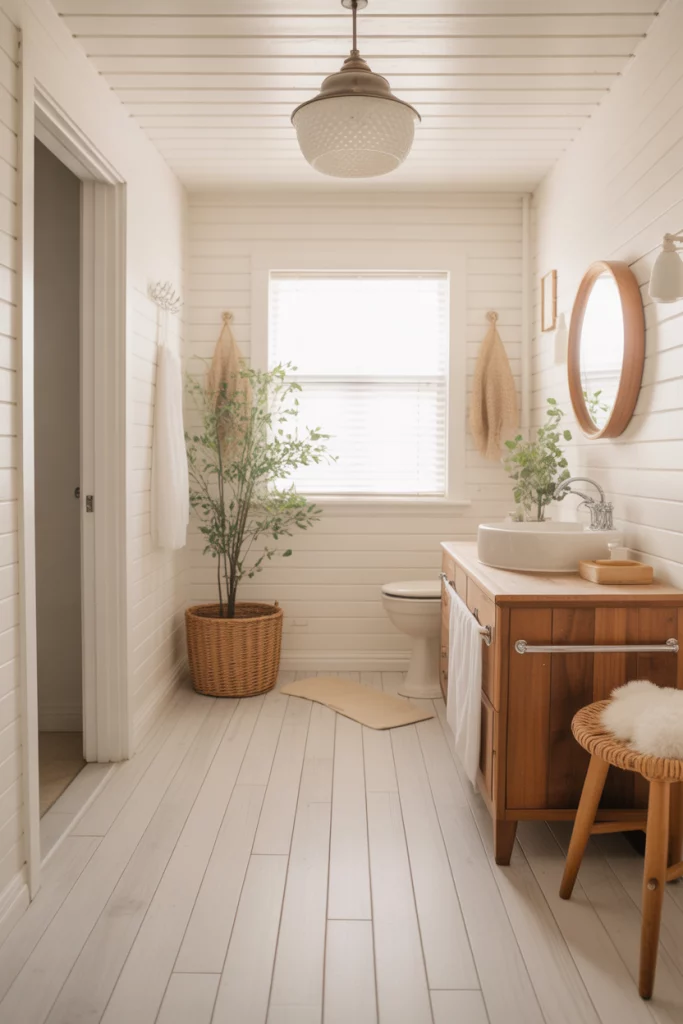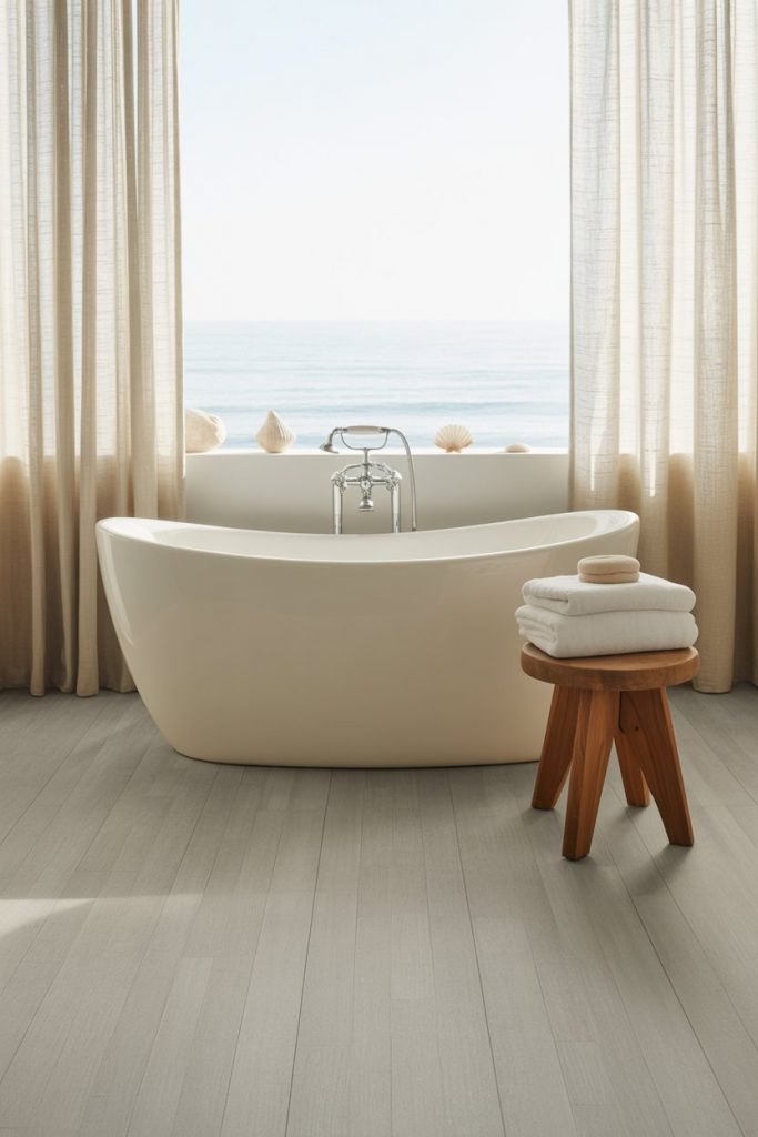 Wood-look vinyl planks in a whitewashed finish bring breezy beach-house energy. A friend with a coastal-style home said it made her mornings feel lighter and more relaxed. This flooring suits bright, window-filled bathrooms, summer homes, and anyone who loves soft, seaside-inspired design.