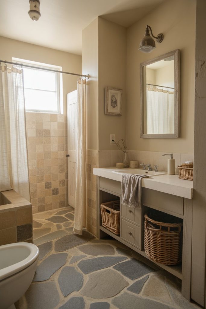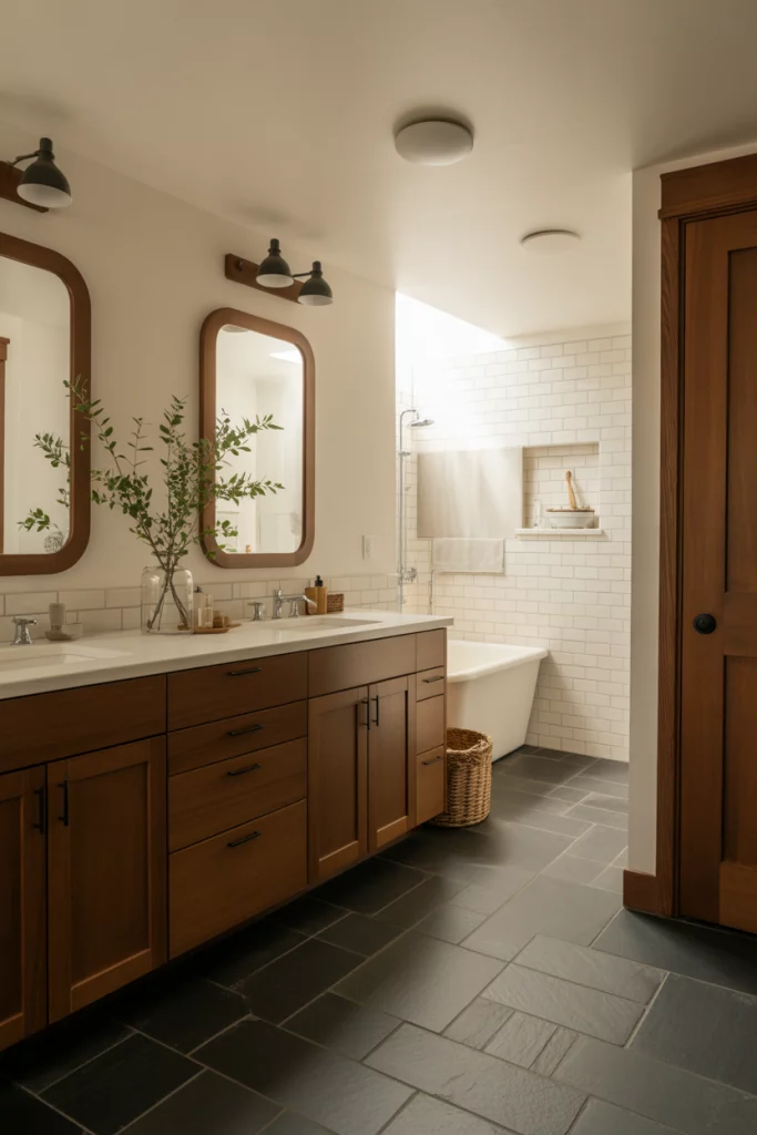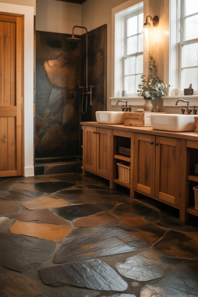 Combining dark slate with farmhouse cabinetry adds depth and rustic character. A contractor once told me slate holds up beautifully in high-traffic bathrooms, making it both stylish and practical. This flooring works in mudroom baths, downstairs half baths, and homes mixing rural warmth with modern edges.