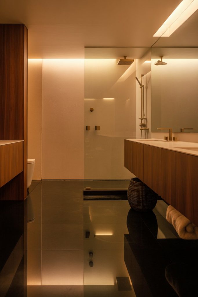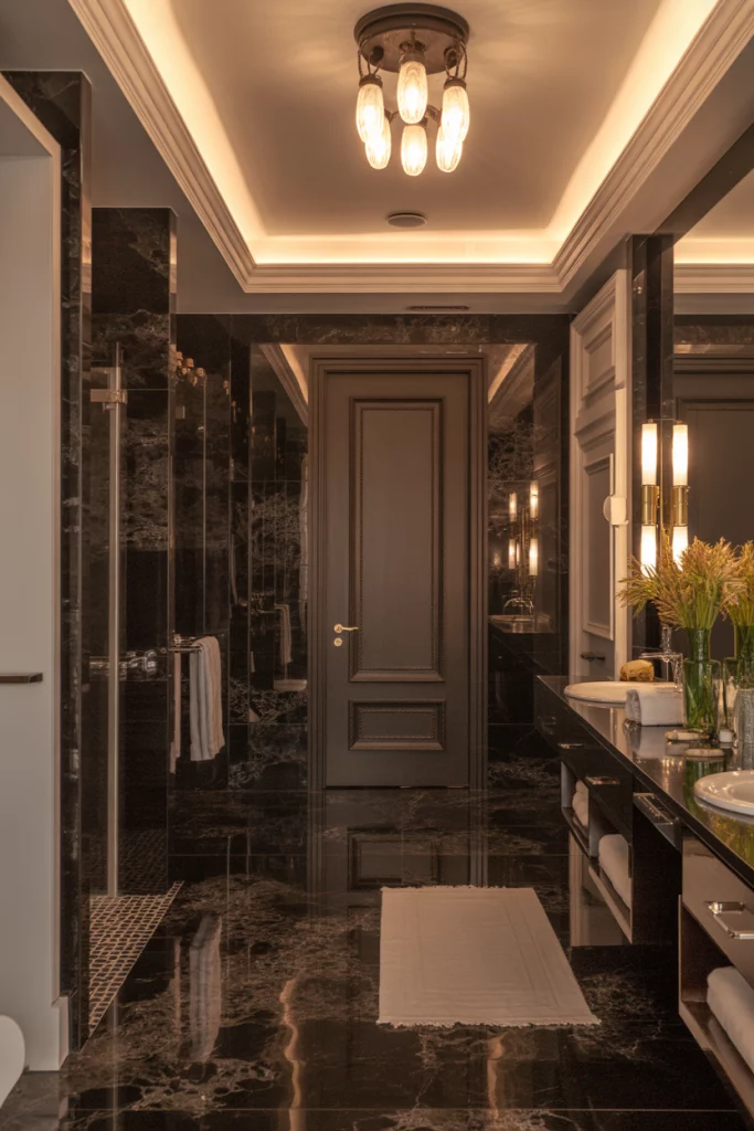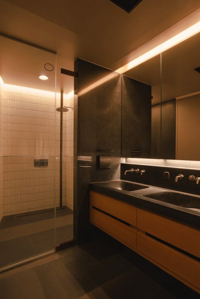 Black stone floors paired with warm lighting create a dramatic yet welcoming mood. I once visited a remodeled master bath where this combination felt like a spa retreat. This design suits larger bathrooms or small rooms with thoughtfully placed lighting to balance the bold flooring choice.