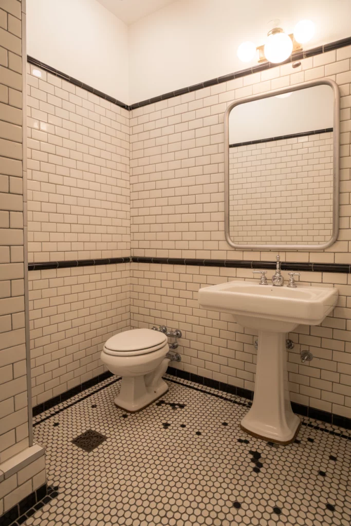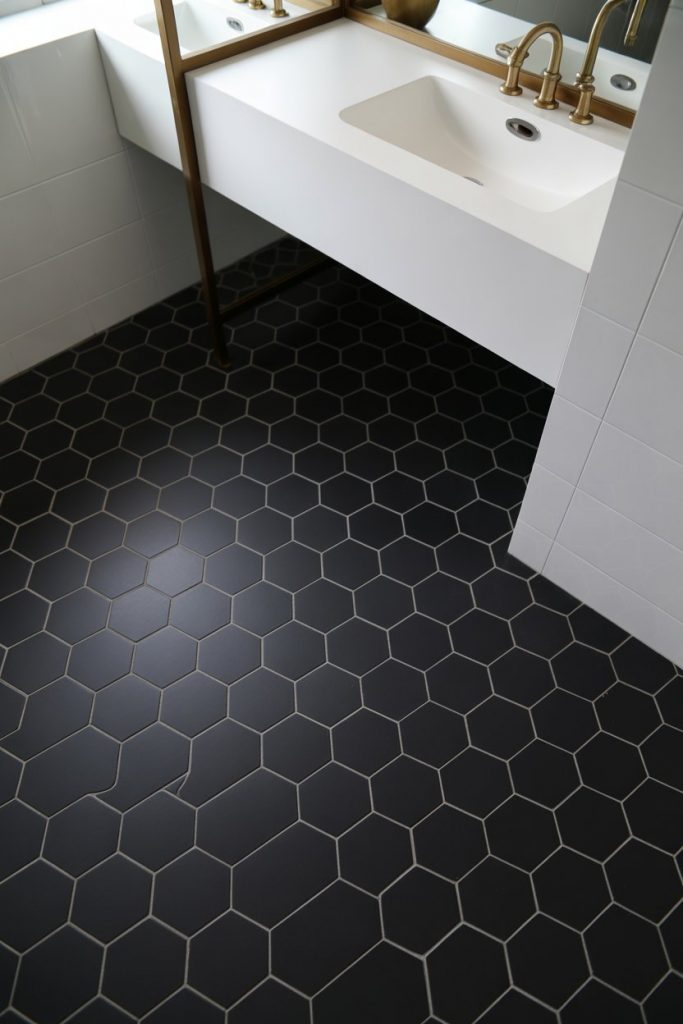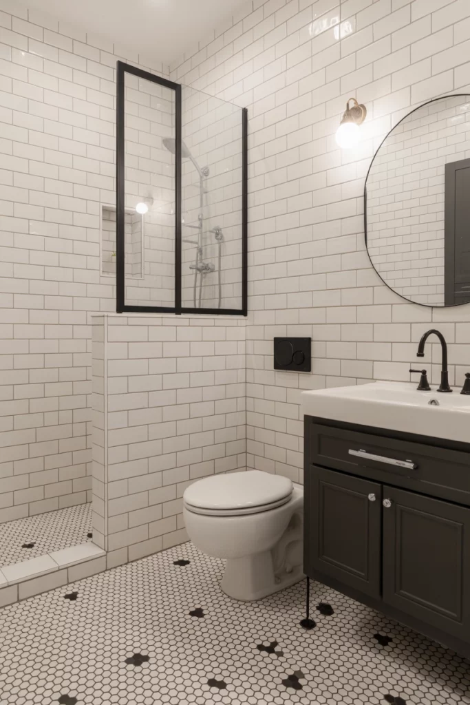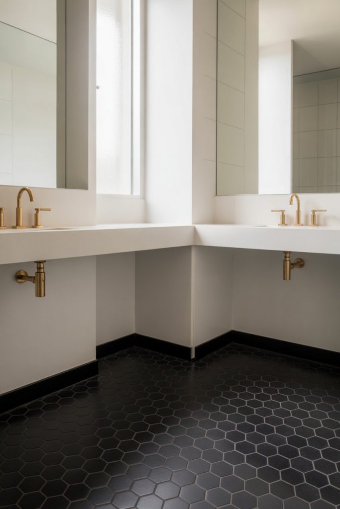 Black tile or small black hexagon tile adds bold contrast that feels instantly sophisticated. In one project I helped with, the dark floor actually made the tiny bath feel more deliberate and stylish. This look suits modern homes, dramatic interiors, or people who enjoy strong visual contrast paired with crisp whites or warm metals.