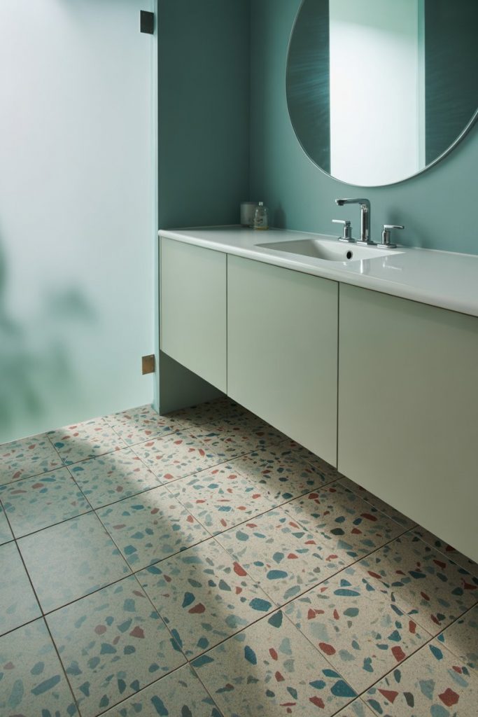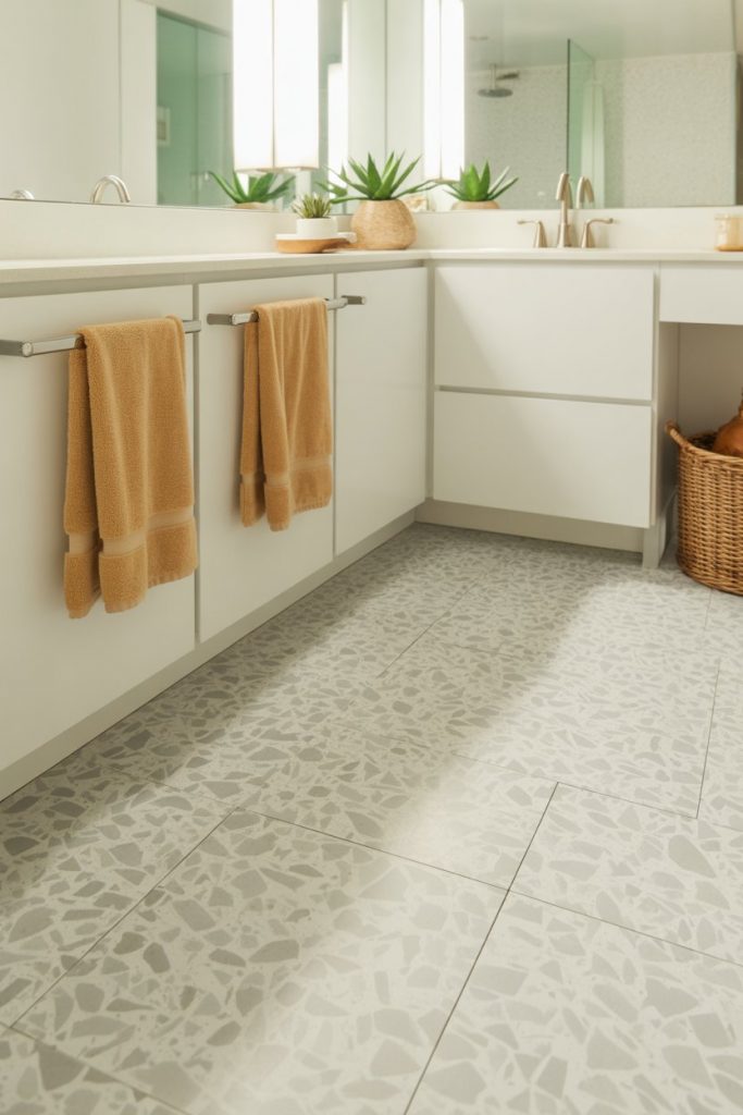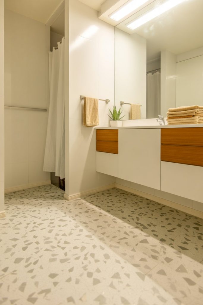 For homeowners working with a budget, vinyl floors that mimic stone or terrazzo offer a surprisingly polished look at a cheap cost. A neighbor once told me guests assumed her floor was real terrazzo. This choice suits rentals, starter homes, or high-traffic family bathrooms where style and practicality need to meet without overspending.