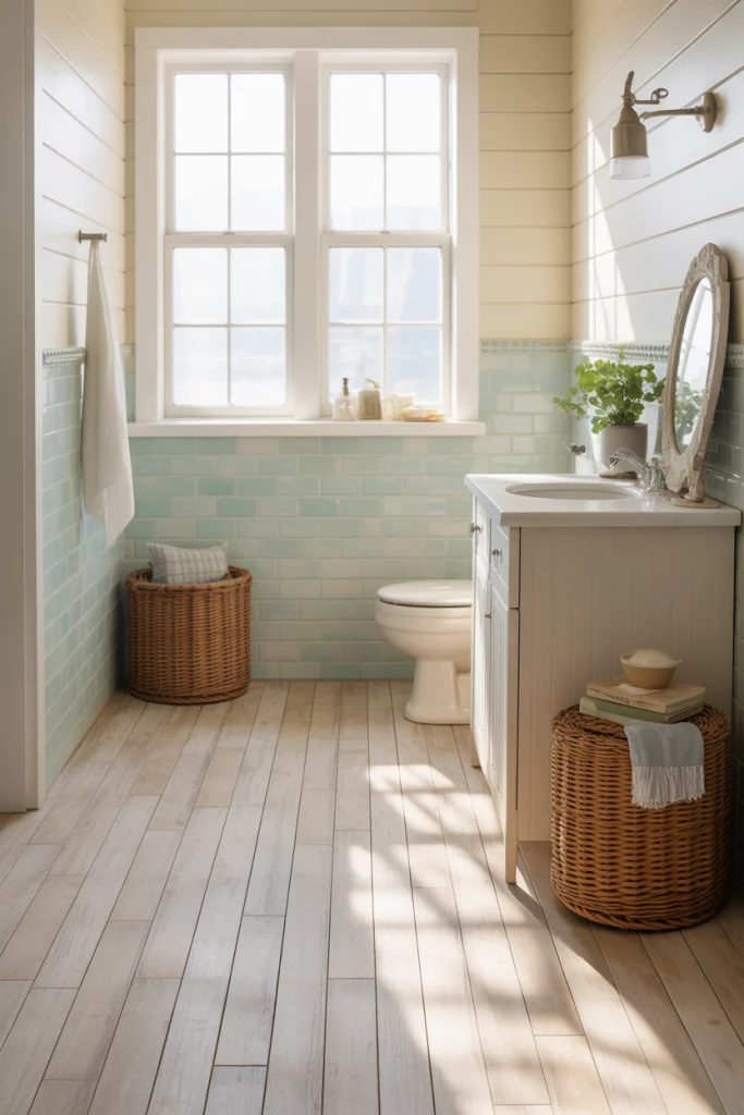The driftwood-toned and sandy-colored flooring works perfectly in the busy morning and guest bathrooms. The farmhouse and coastal blend offers a relaxed and soft feel, which is great in family homes. A real estate friend is often saying how buyers love the blend because it is familiar but also has a brightness that becomes embedded in everyday comfort without effort.